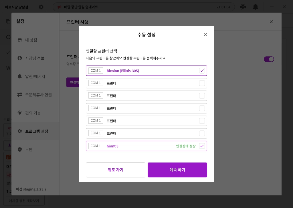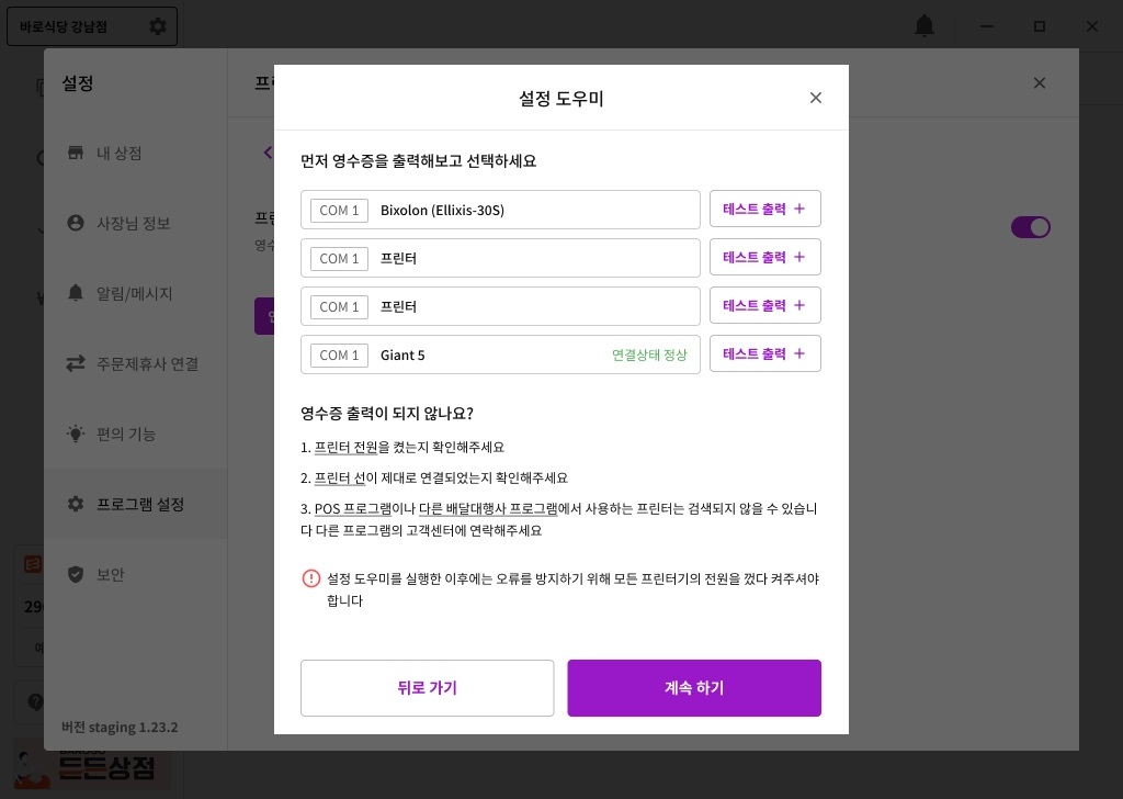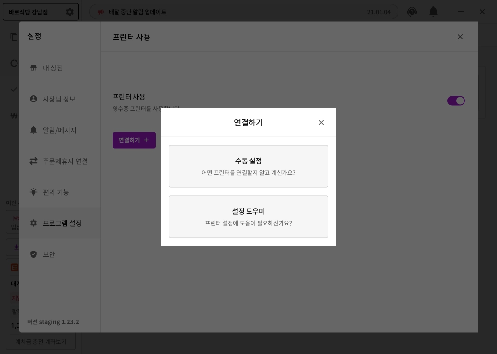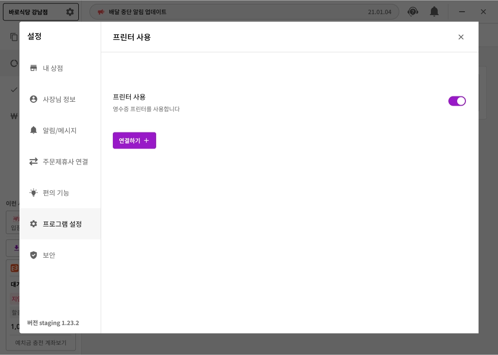 POS 또는 타 배달대행사 프로그램과의 연결. 이미 연결되었다면 출력이 되지 않을 수 있습니다. 해당 프로그램 고객센터에 문의해주세요.