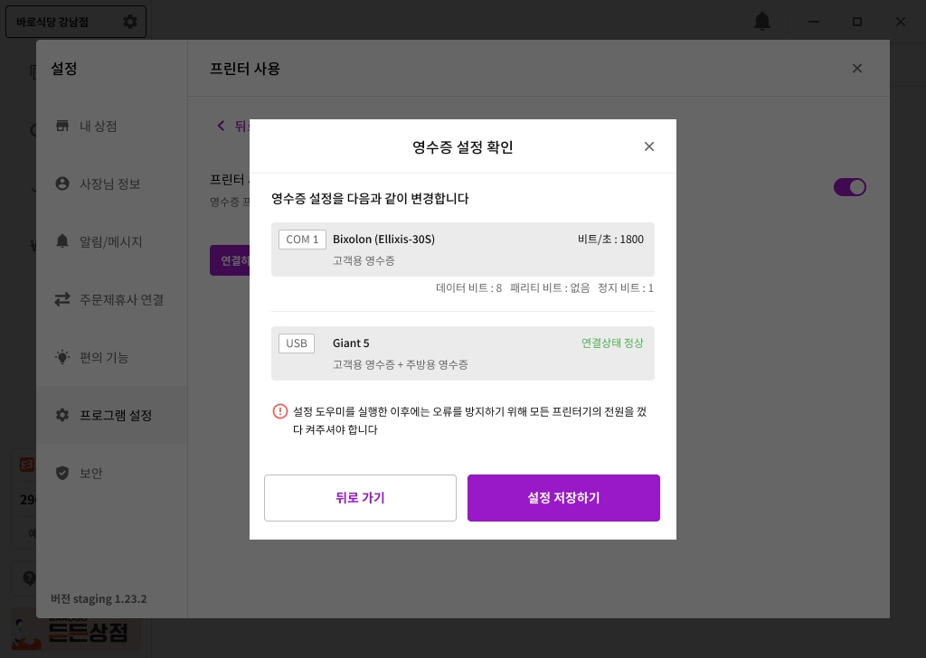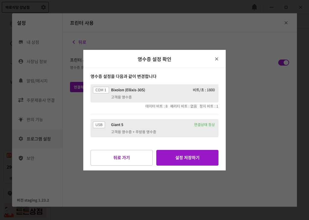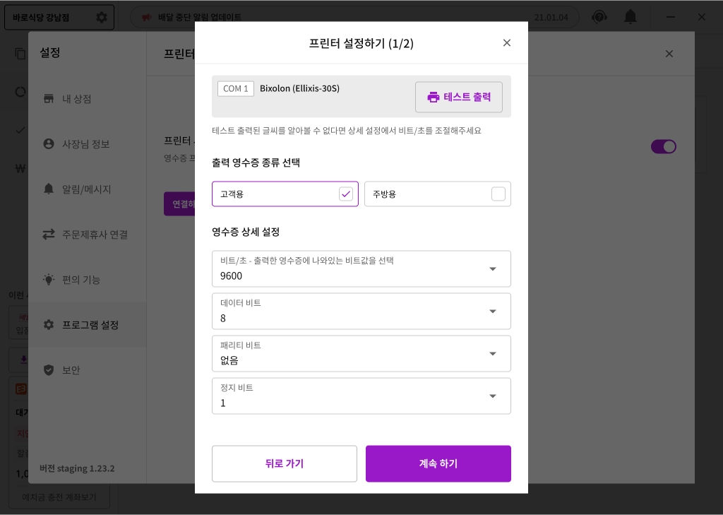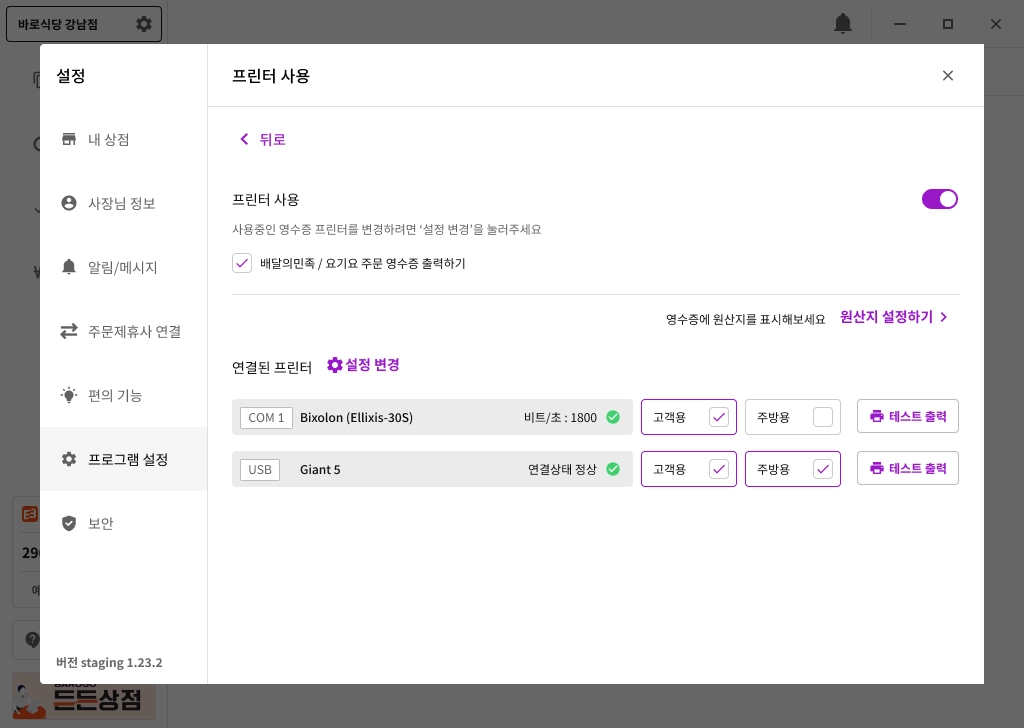 에서 배달용 / 주방용 영수증 선택과 테스트 출력이 가능합니다.