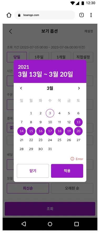 조회 기간 : 원하는 기간 선택이 가능하고, 직접 설정은 특정 날짜 범위로 확인합니다.