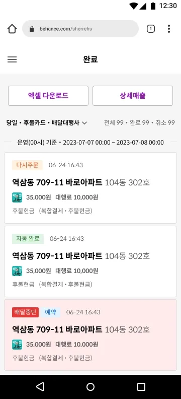 ❗️ 최초 진입 시 보여지는 리스트는 당일 기준에 완료된 주문 건입니다.