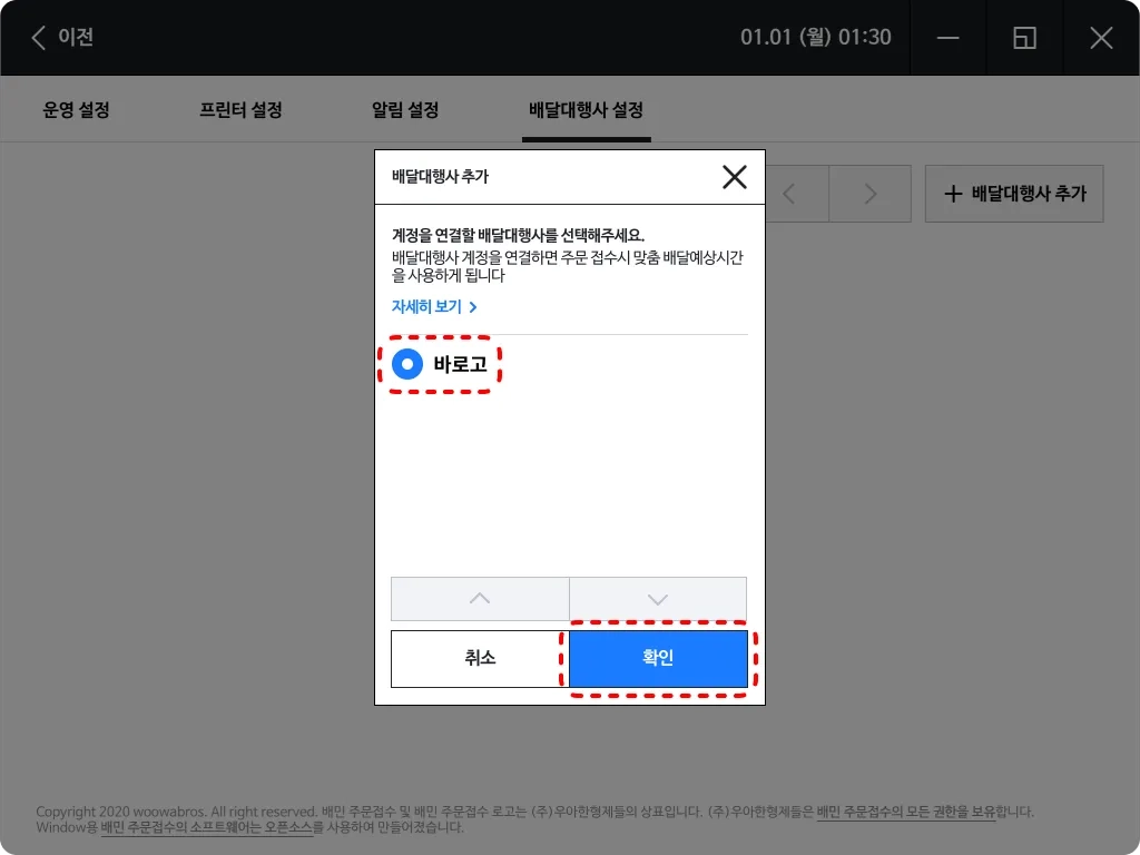 배달대행사 추가 팝업에서 바로고 를 선택합니다.