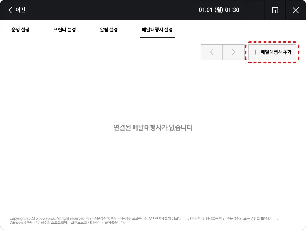 배달대행사 설정 탭에서 배달대행사 추가를 선택합니다.