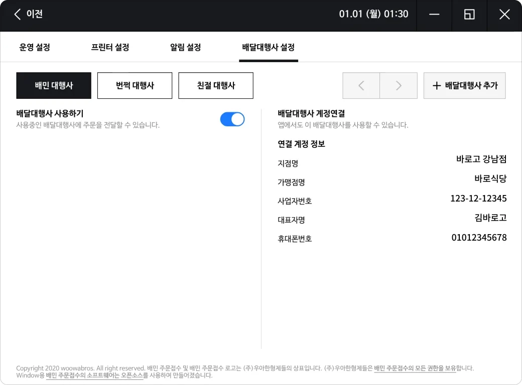 배달의민족 주문 접수 프로그램에 배달대행사가 추가되었습니다.