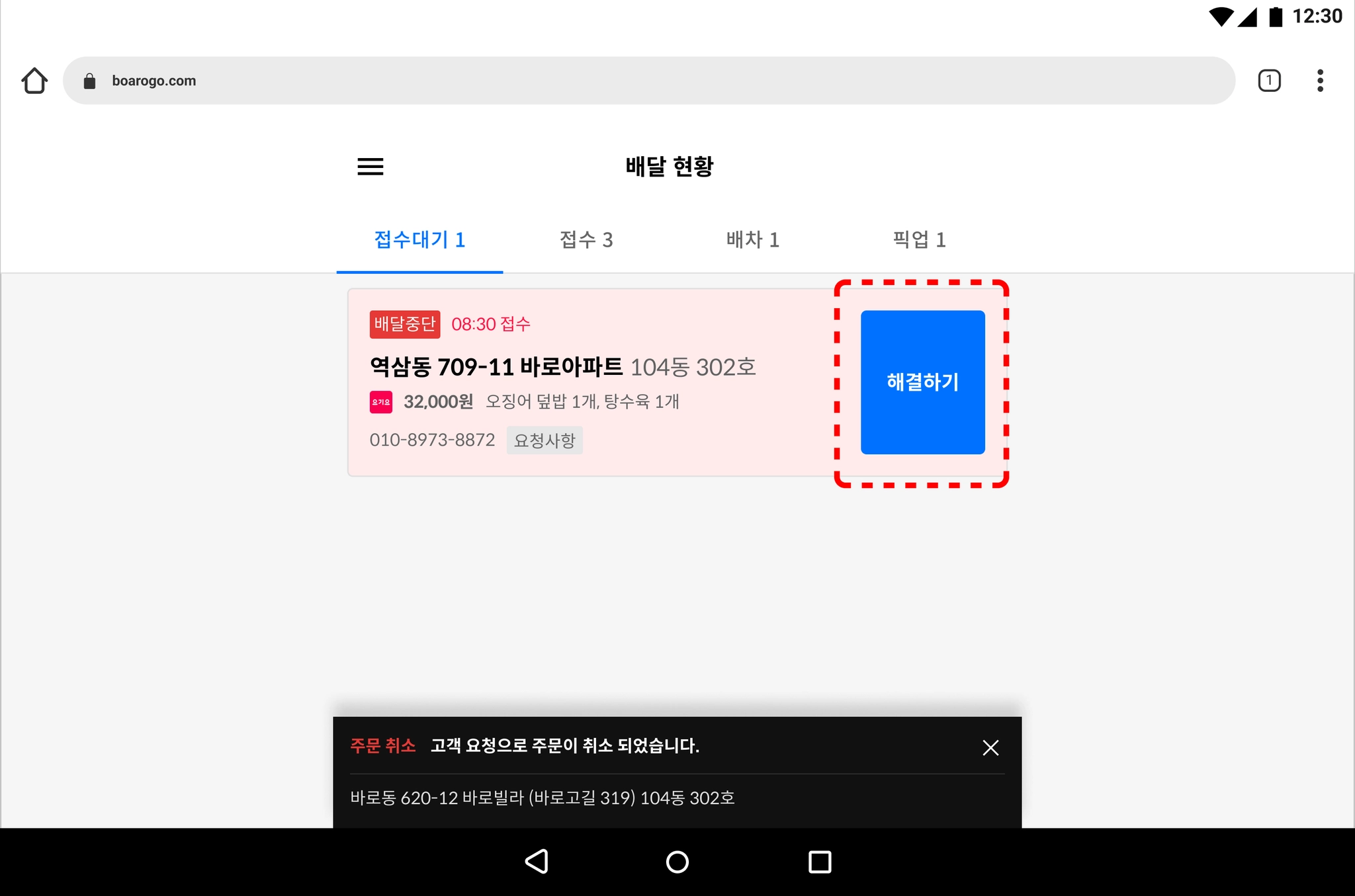 진행중 리스트에서 붉은색으로 변한 카드로 배달 중단 상태를 확인하세요.