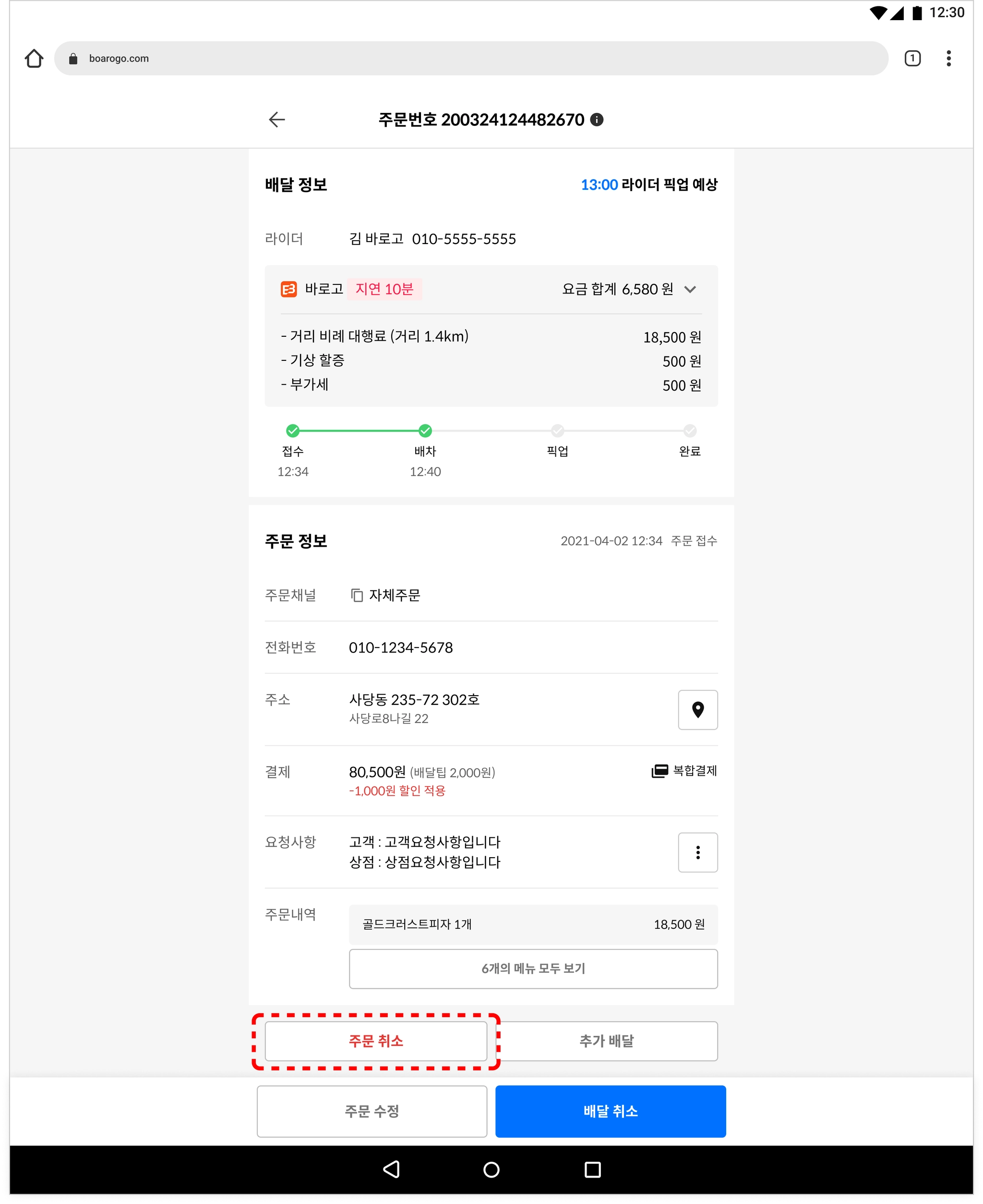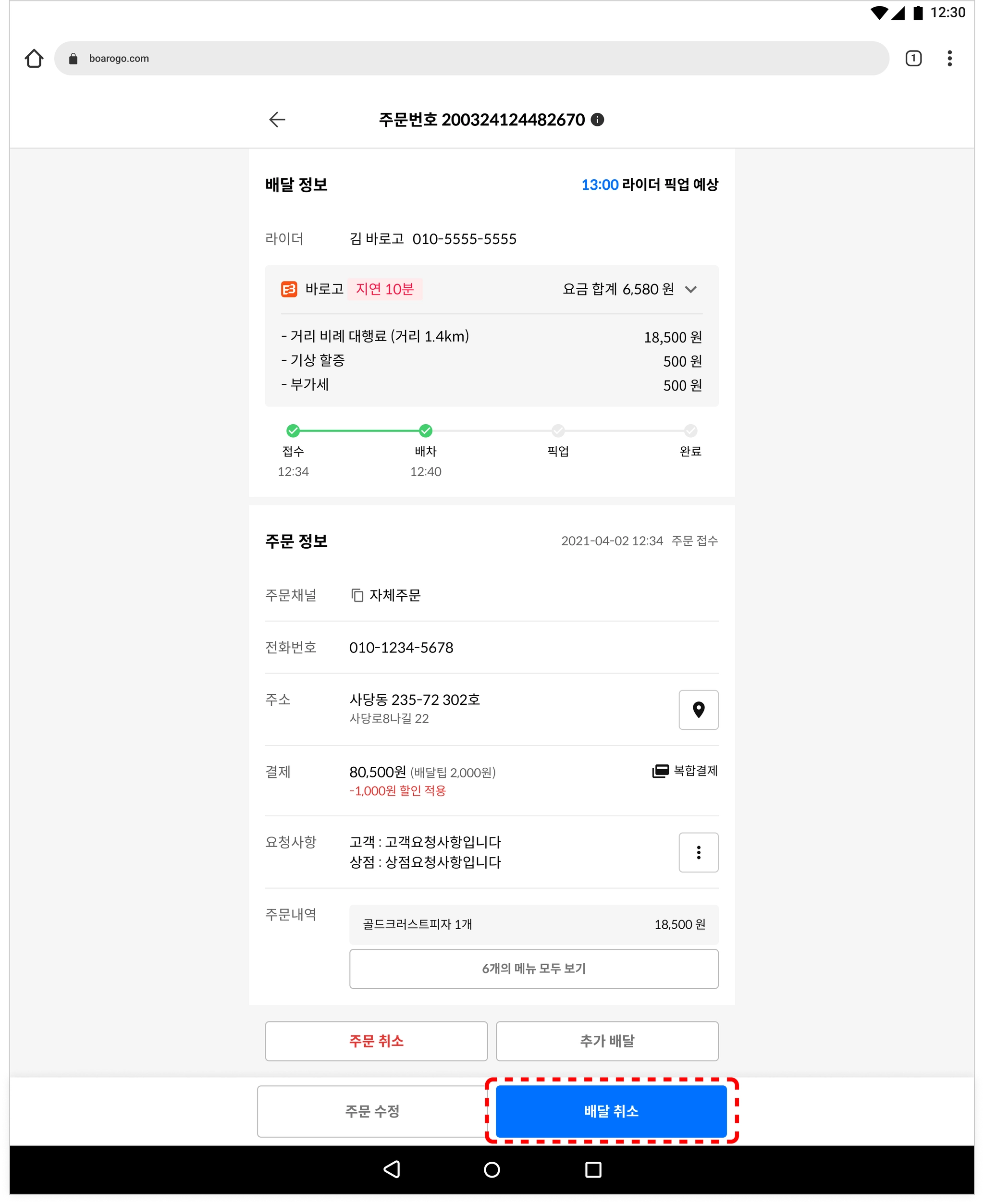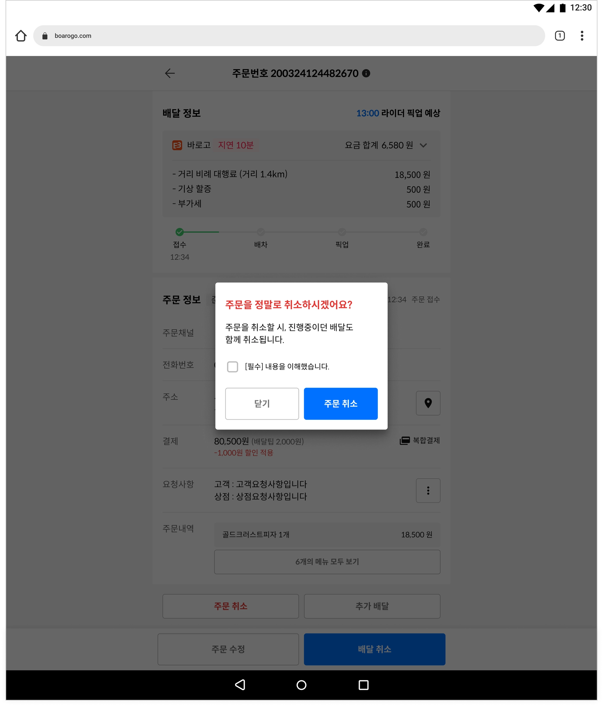 ❗️ 배달 요청된 주문을 취소하게 되면 배달, 주문 둘 다 취소됩니다.