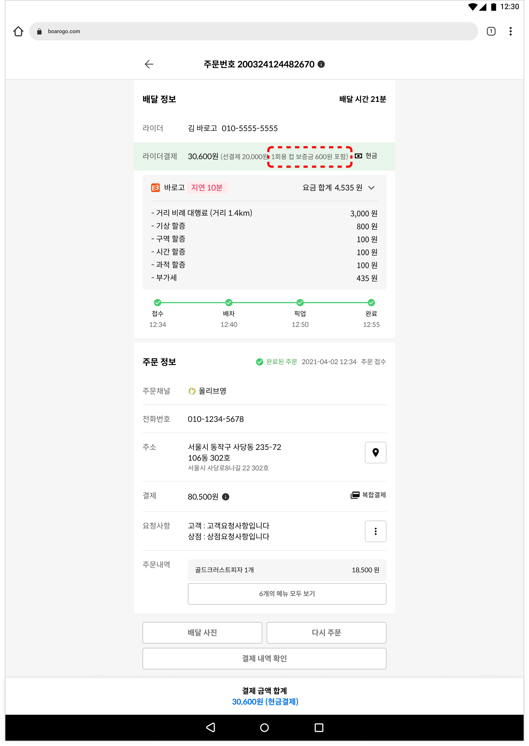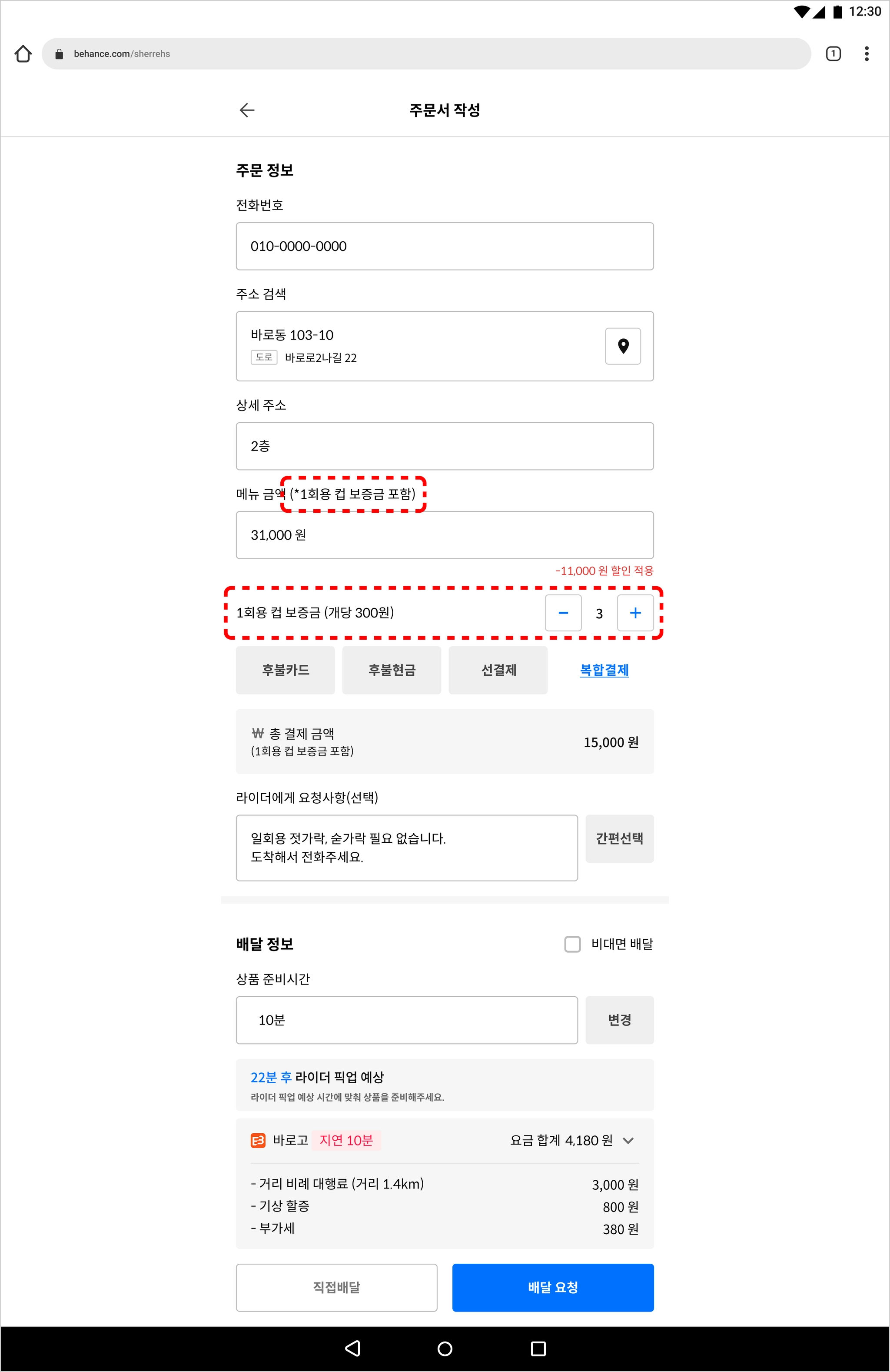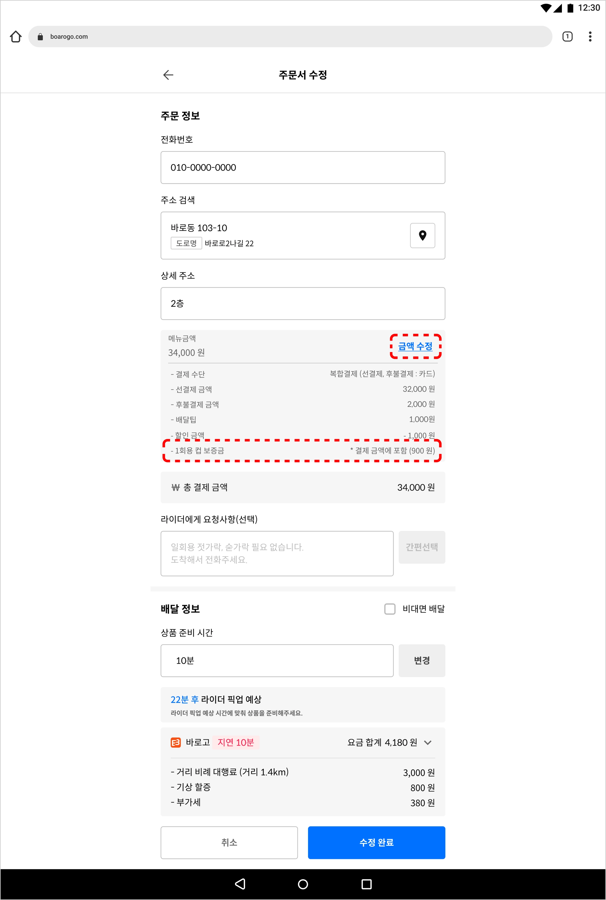 배달 정보 녹색 박스 발생한 경우 배달 대행사를 통해 1회용 컵 보증금 금액이 수정된 경우입니다.