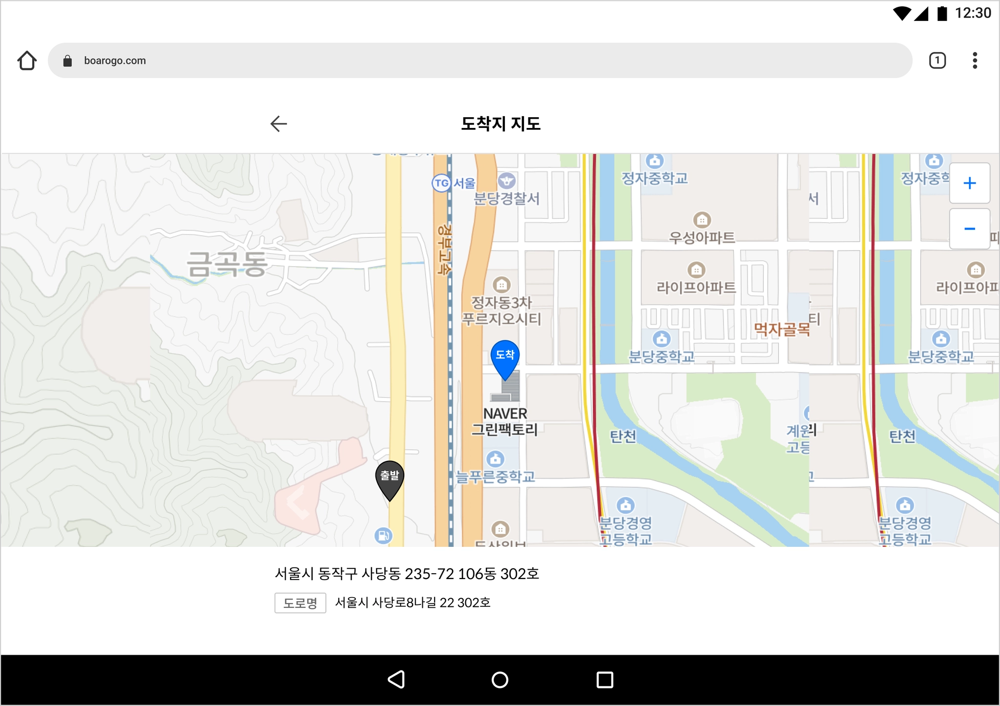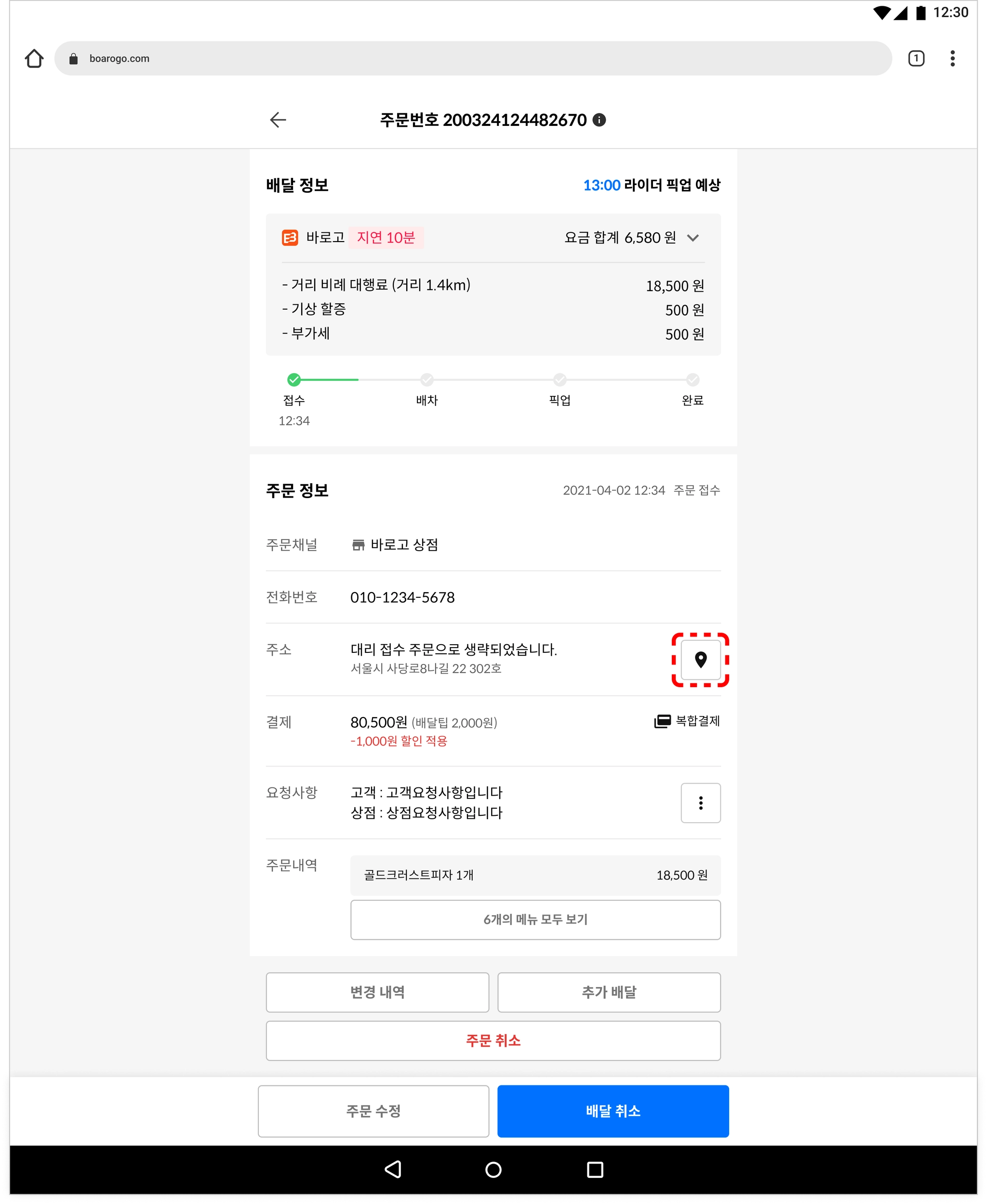 주문서 상세 화면 혹은 주문서 작성에서 주소 검색 영역을 채웠을 경우 배달할 위치의 지도를 확인할 수 있습니다.