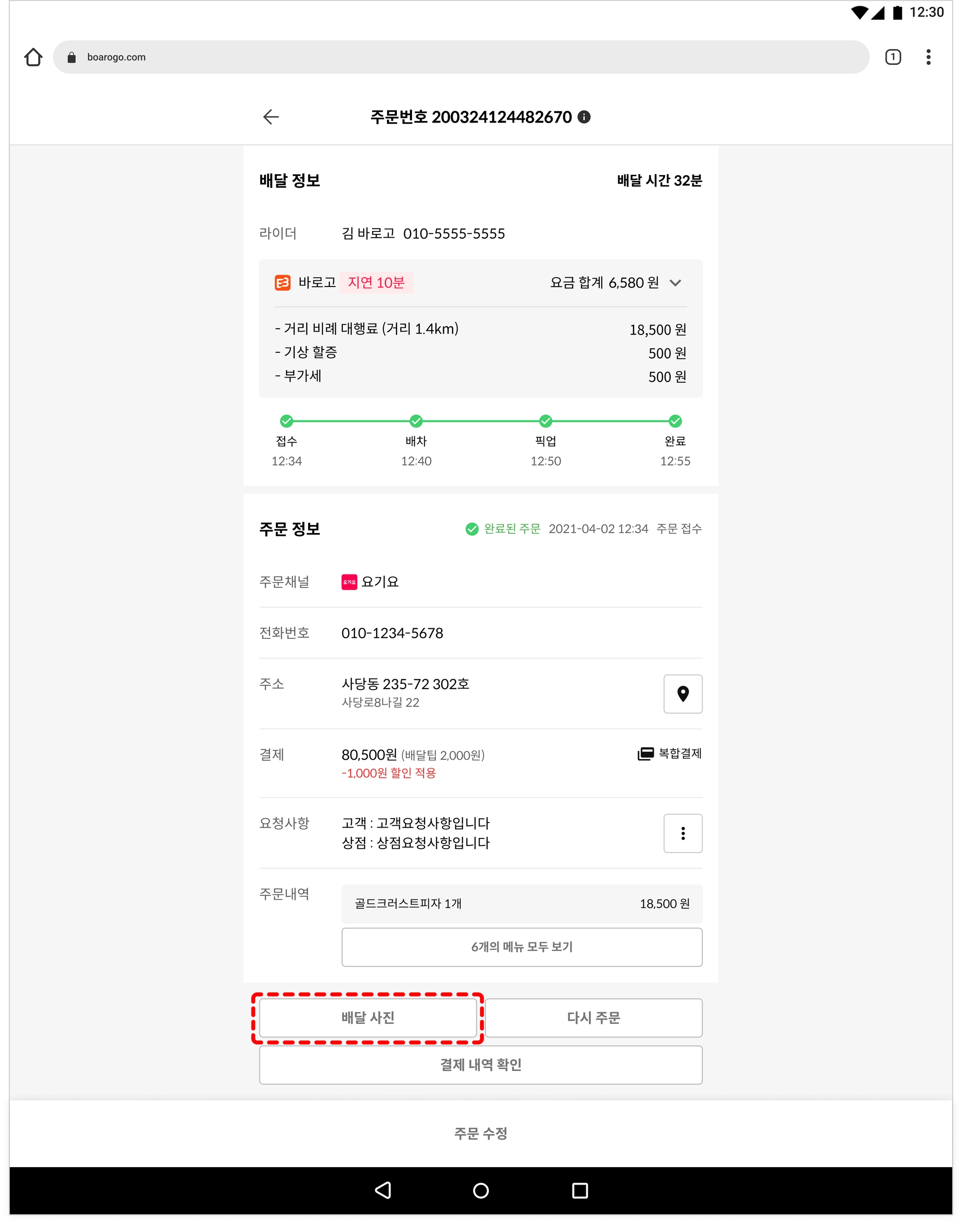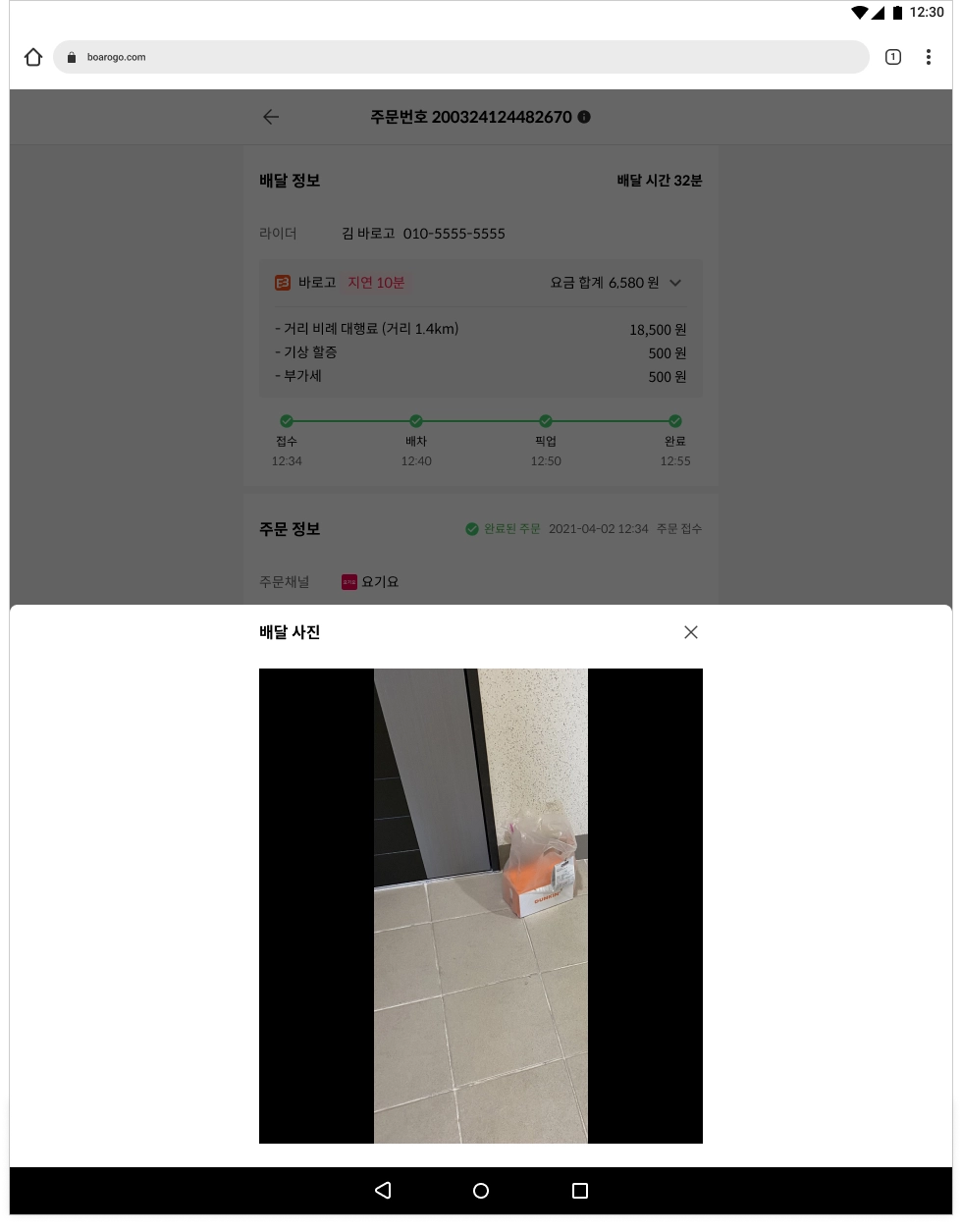 완료된 주문 상세 내역에서 배달 사진 버튼을 누르면 라이더님이 촬영한 배달 인증 사진을 볼 수 있습니다.
