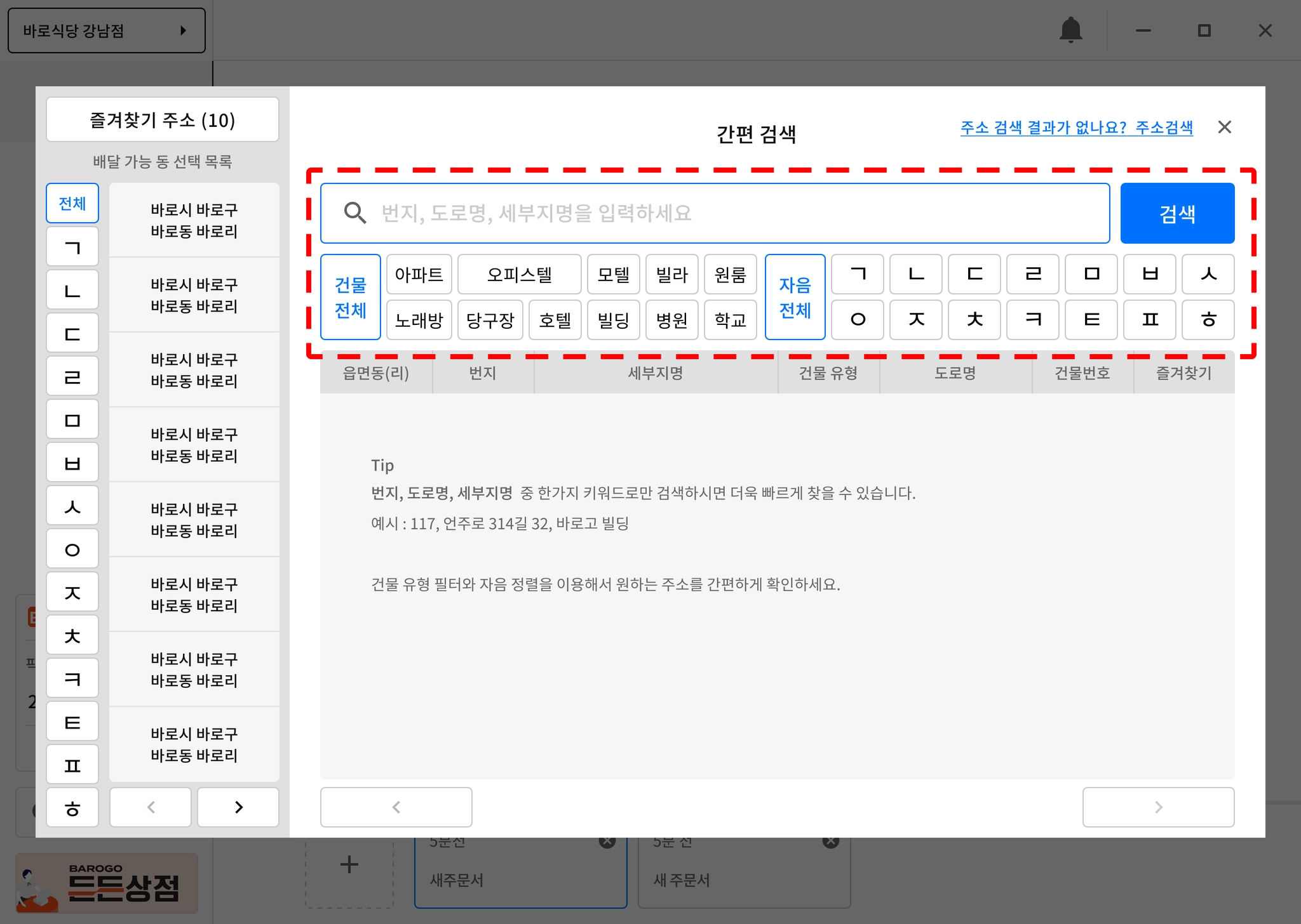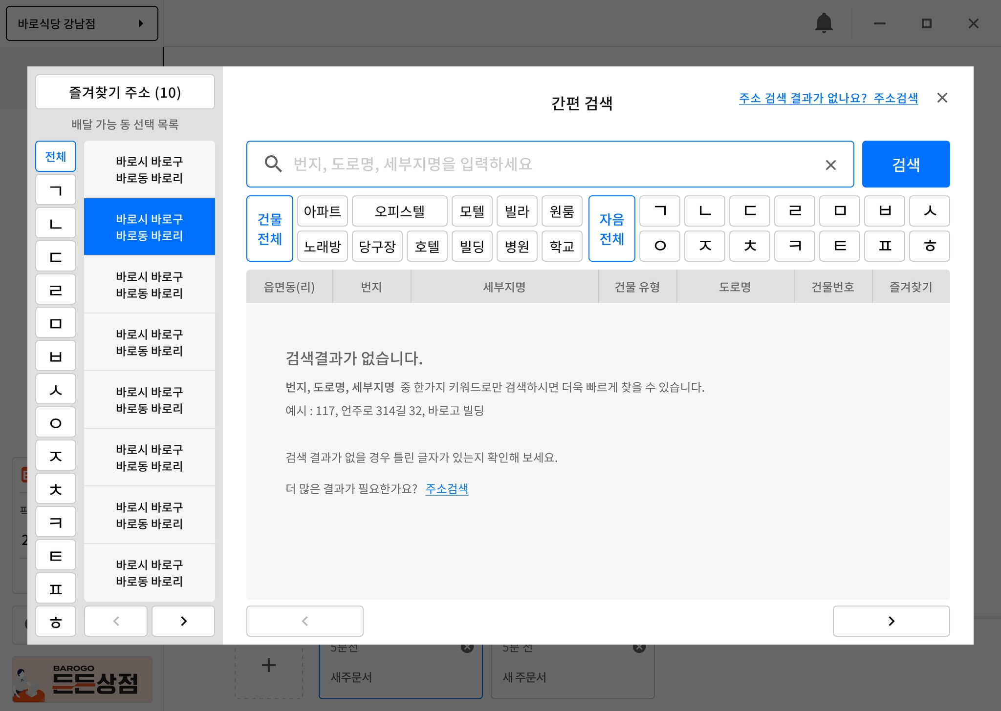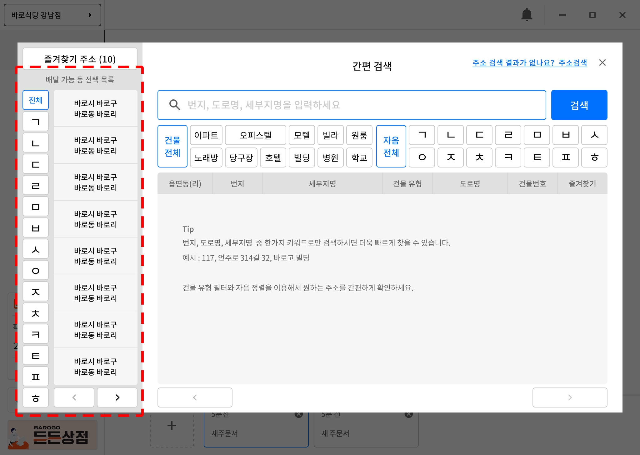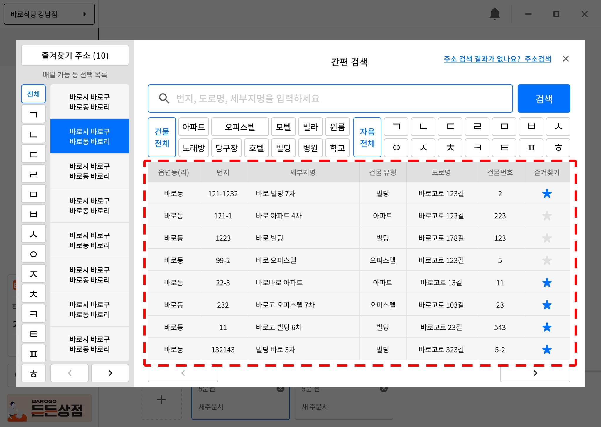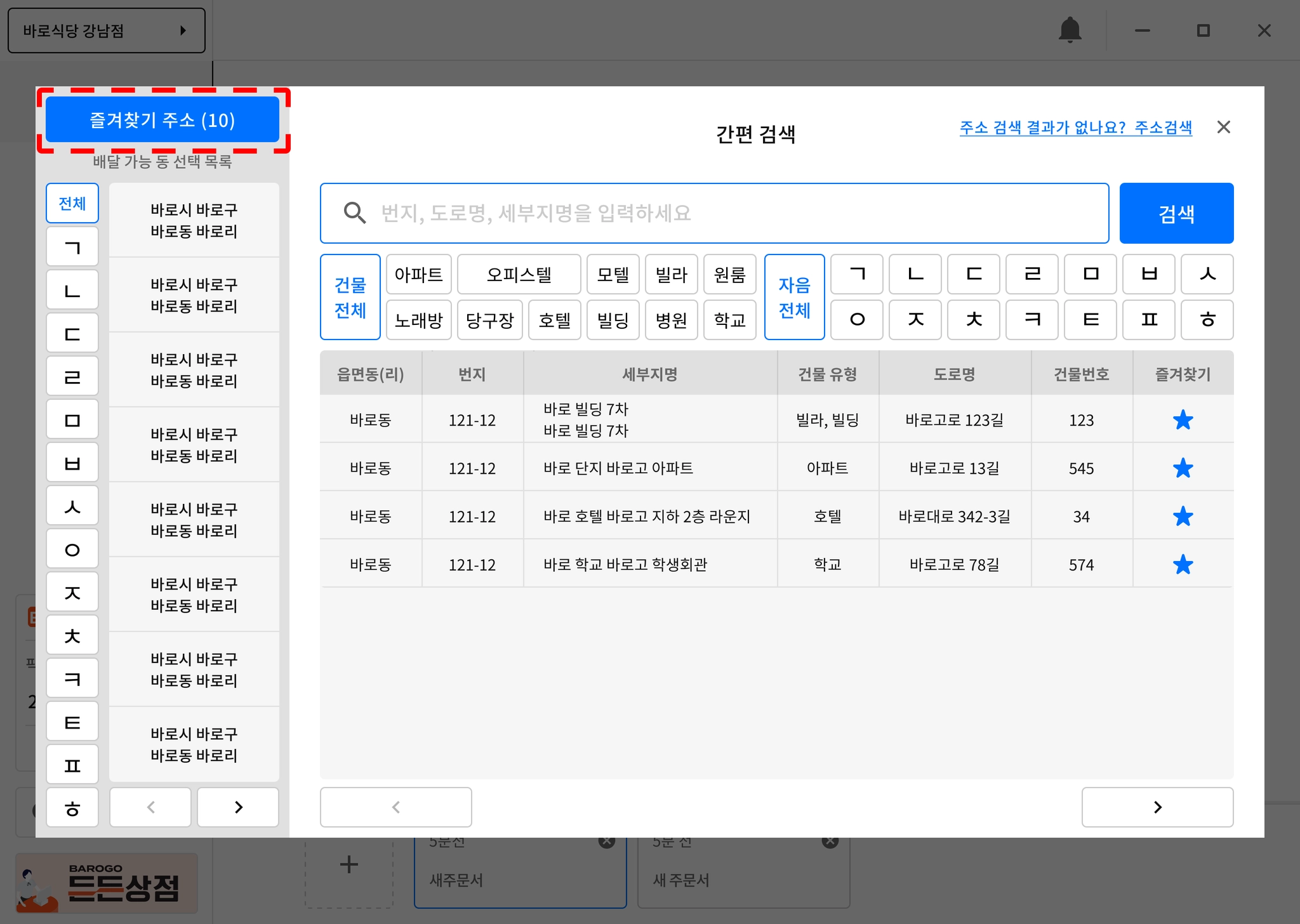 즐겨찾기 주소 리스트는 검색동 선택과 관련없이 즐겨찾기 등록순입니다.