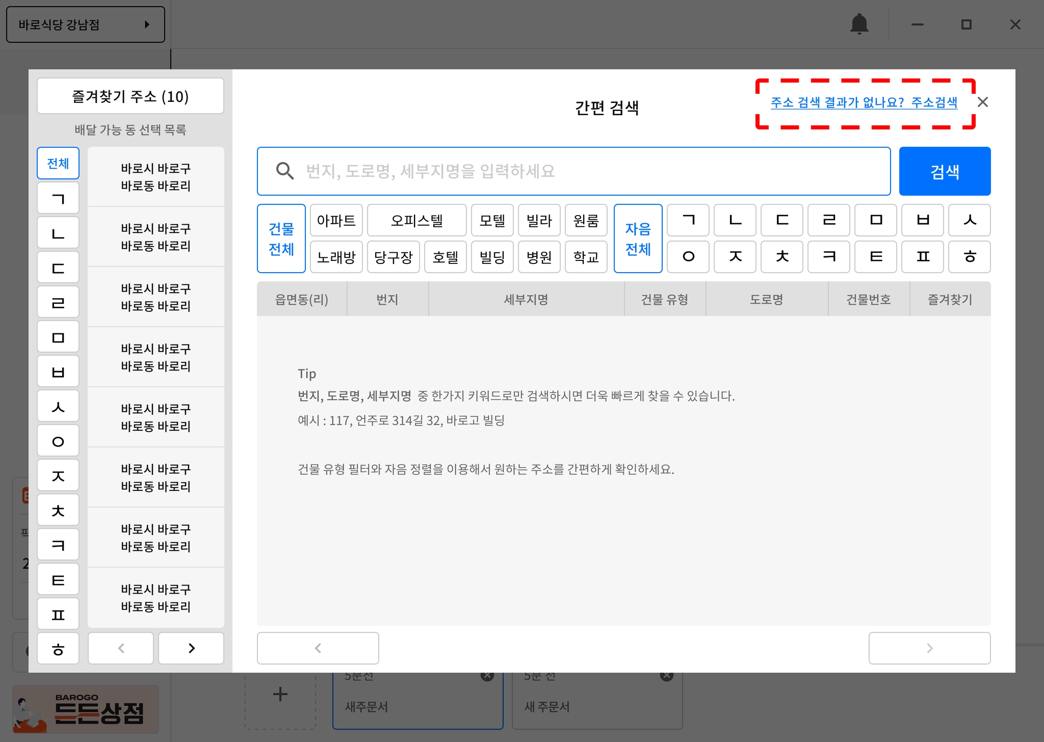 주소검색 결과가 없나요? 주소검색 안내 버튼을 클릭하면 바로 주소 검색 페이지로 이동합니다.