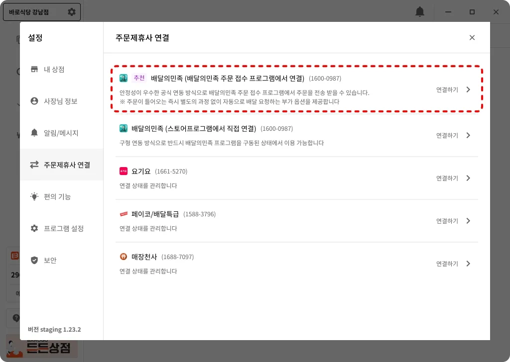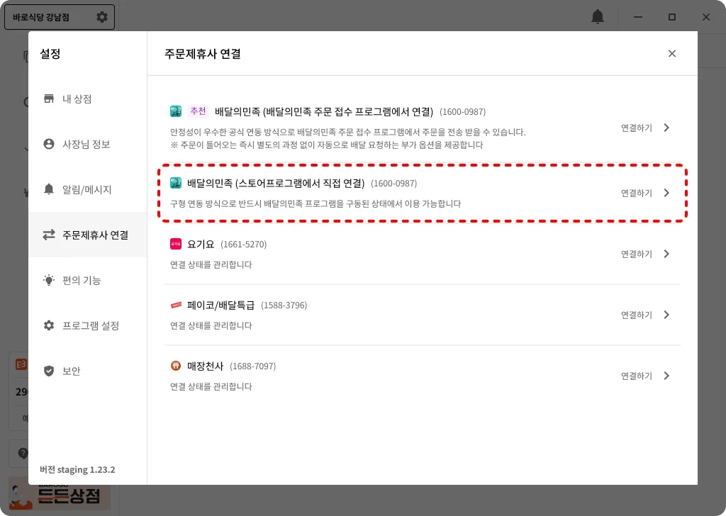 배달의민족(스토어 프로그램에서 직접 연결) 연결 시 배달의민족 주문 접수 프로그램을 실행해주세요.