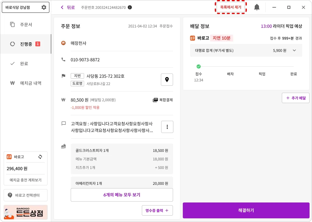 이미 배달 대행 요청을 하셨다면 배달 취소 를 하고 목록에서 제거를 해주세요.