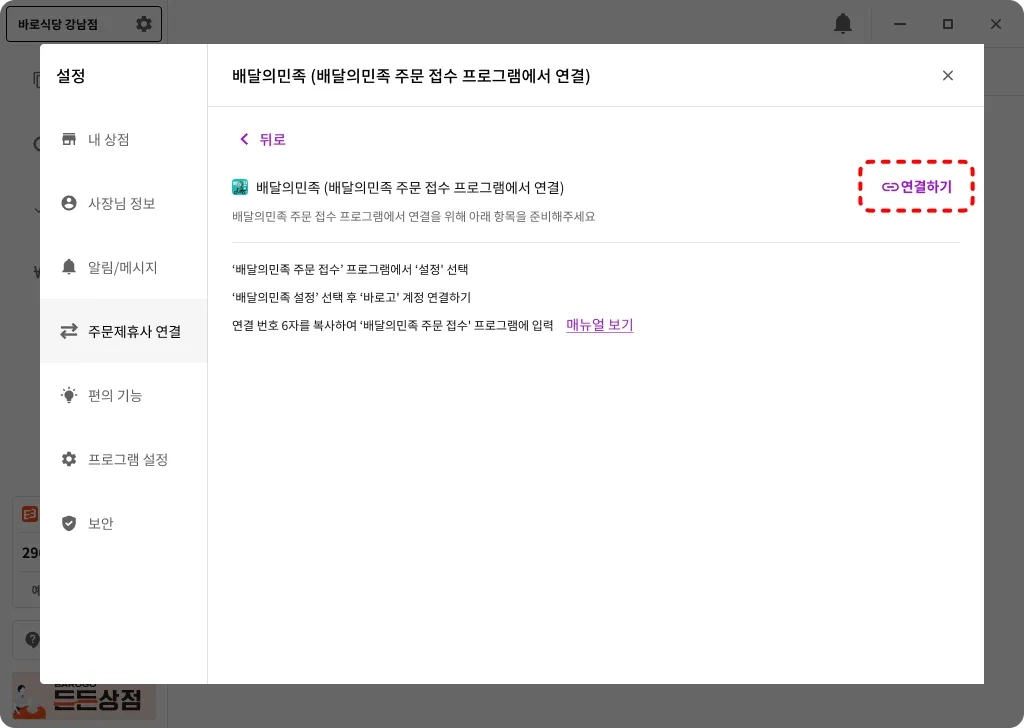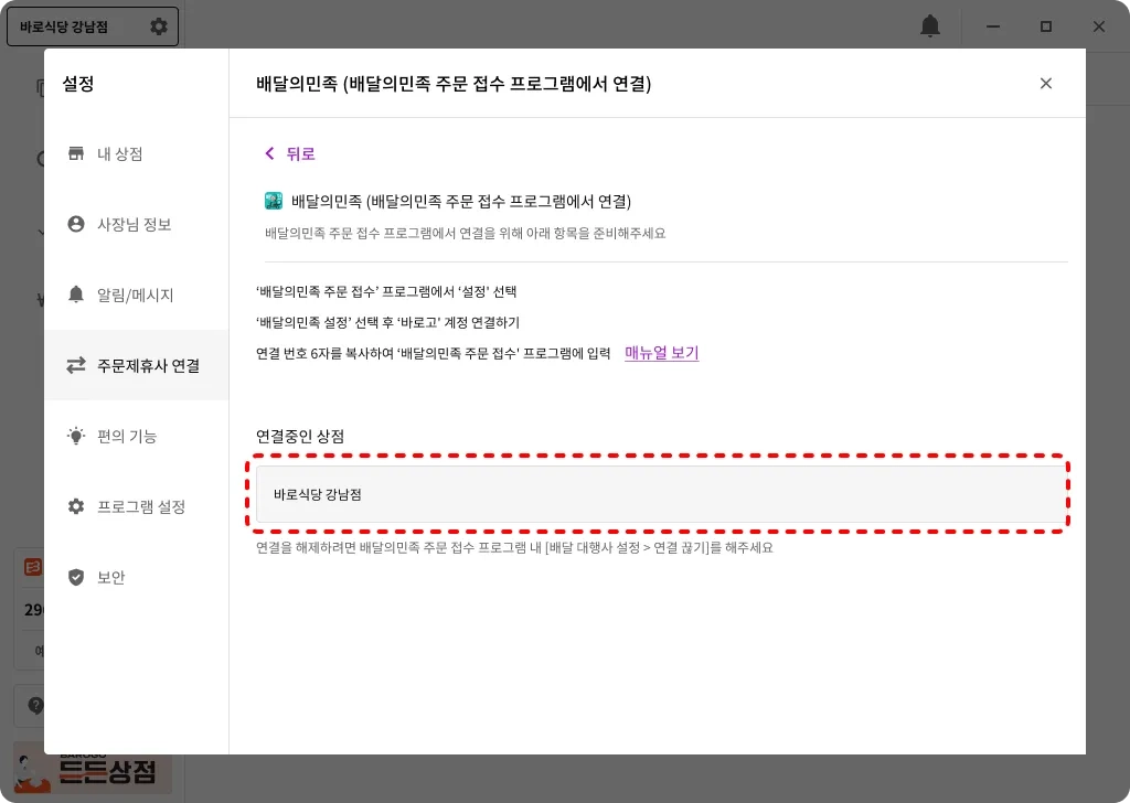 배달의민족 주문 접수 프로그램에서 발급받은 연결 번호로 스토어프로그램 연결하기
