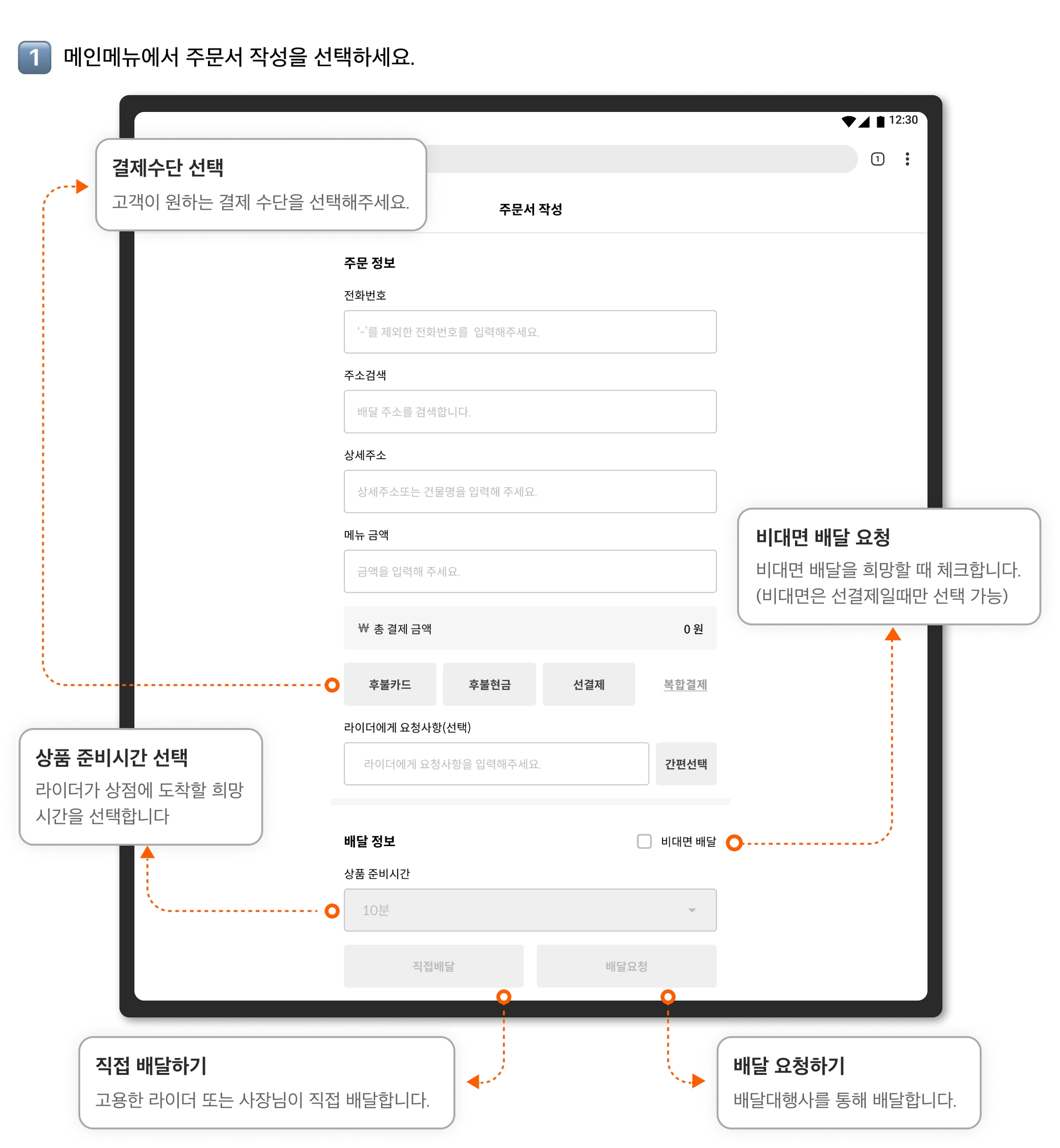 전화 또는 방문 고객의 배달 접수가 필요할 때, 주문서를 직접 작성하여 배달을 요청할 수 있습니다.