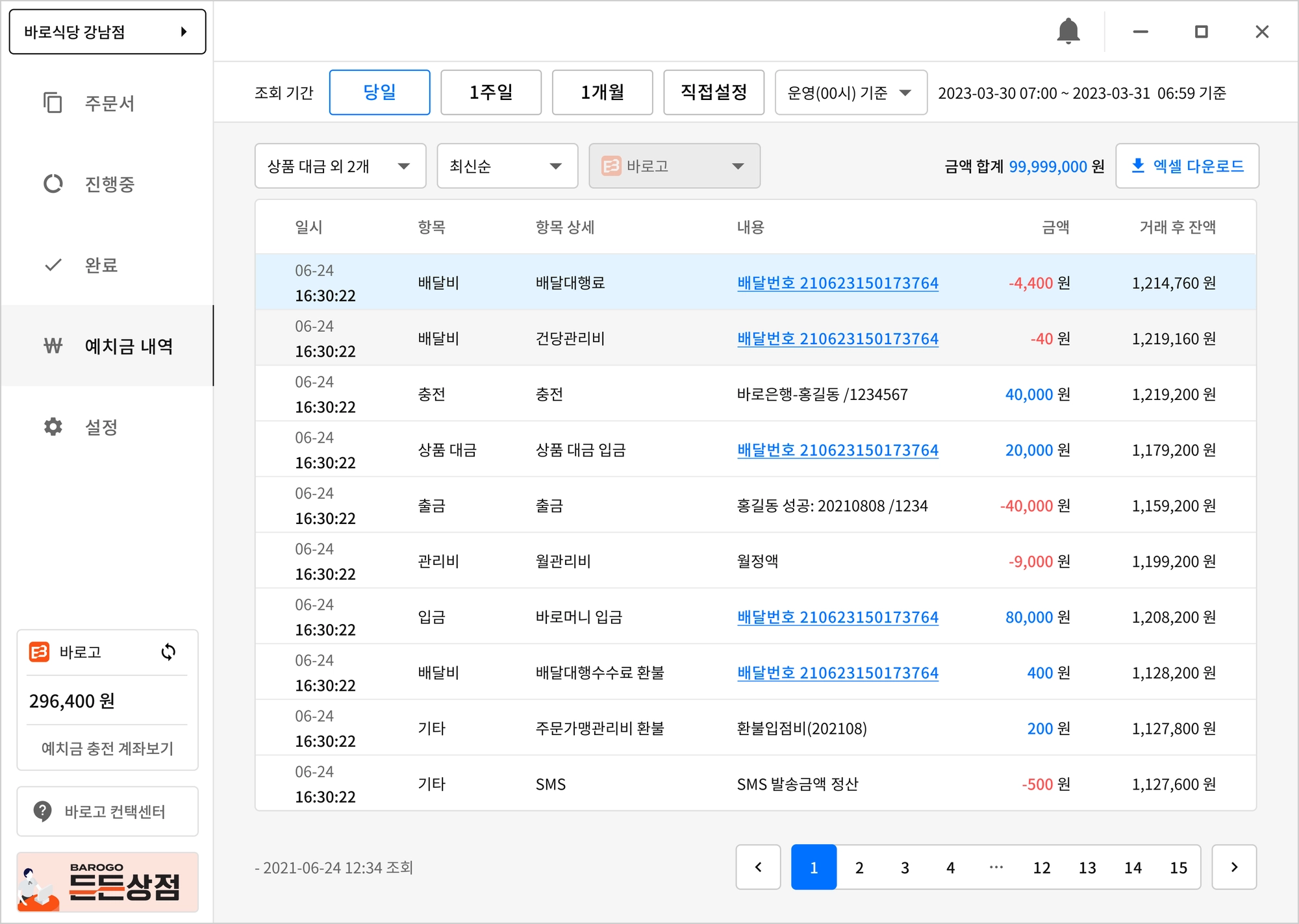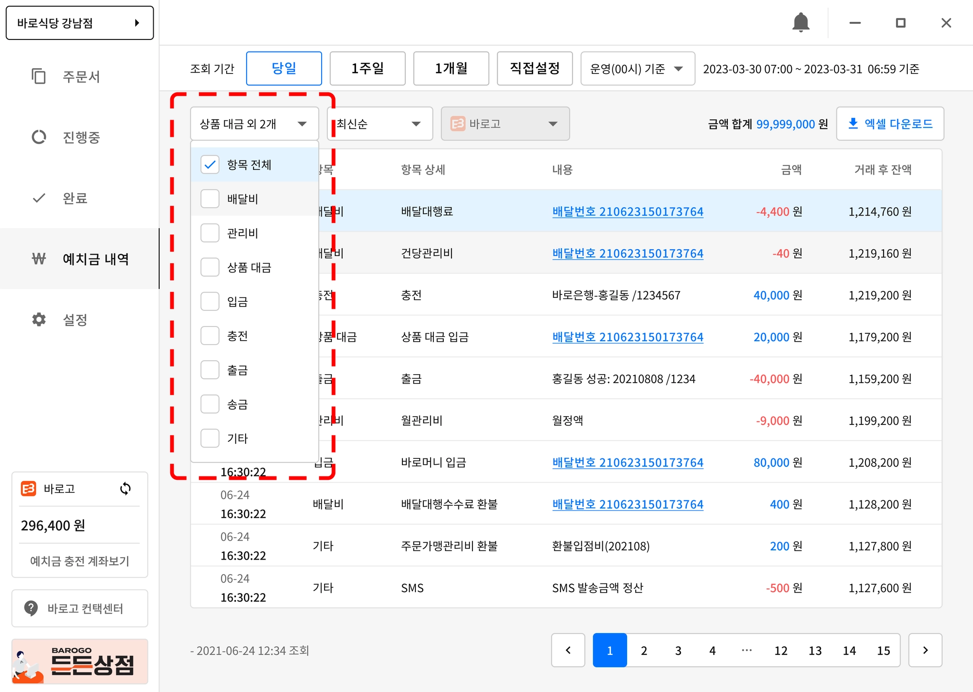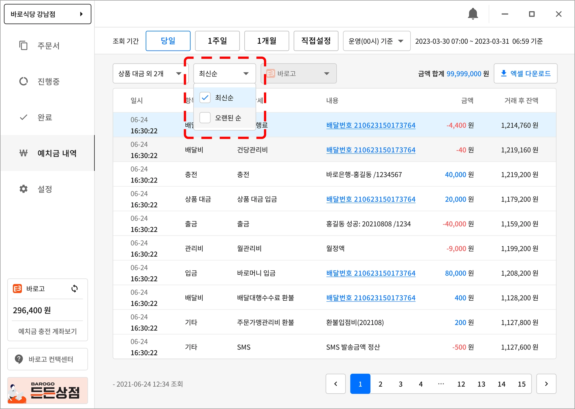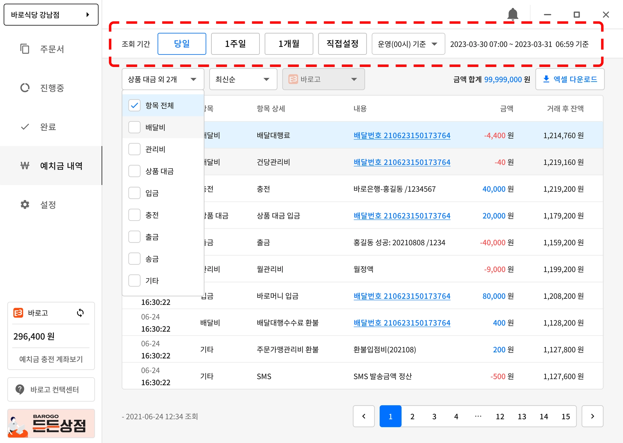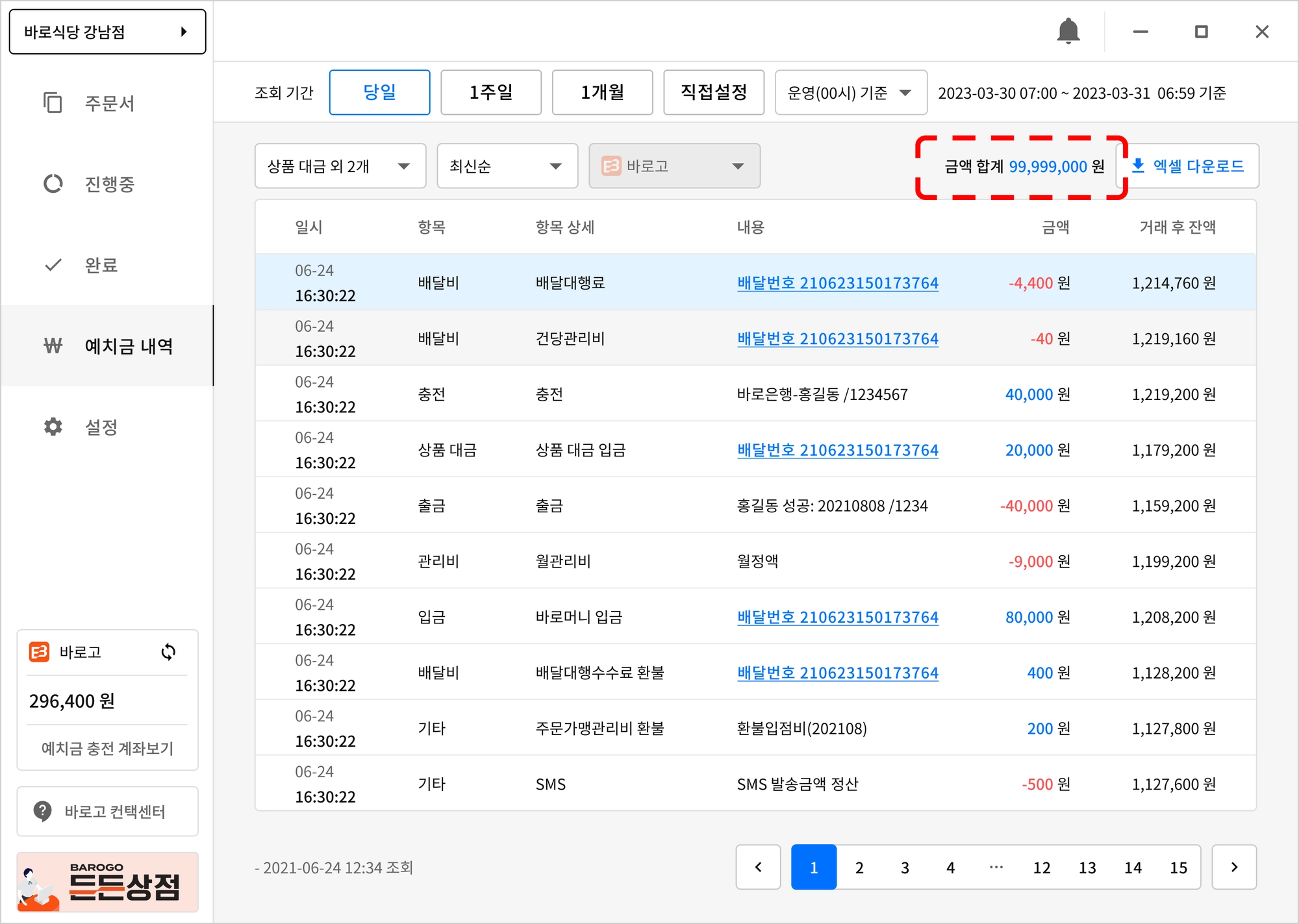 예치금 합계가 - 인 경우는 “빨간색”으로 구분하여 표기 됩니다.