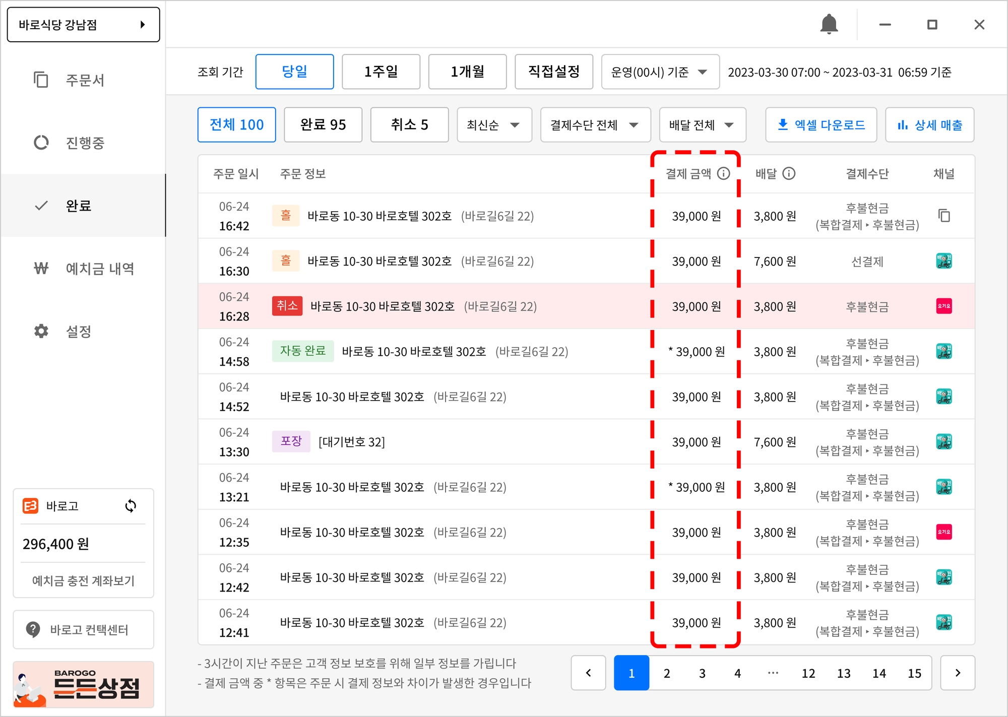 주문 금액에 * 표기가 되어 있는 주문은, 최초 주문접수시 결제금액과 실제 라이더가 결제한 금액에 차이가 있는 주문입니다.