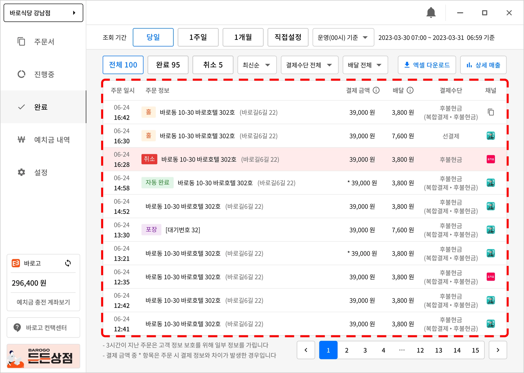 붉은색 배경으로 표기된 주문은 취소된 주문입니다.