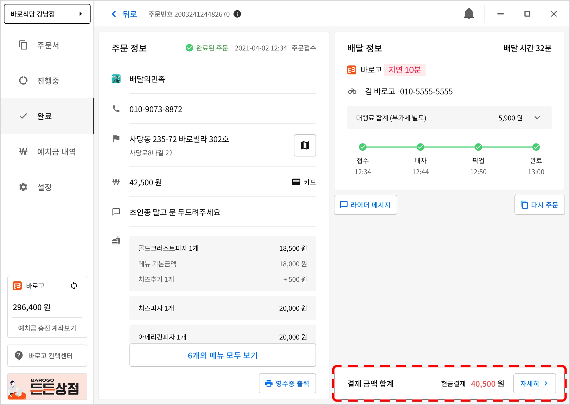 최초 주문했을 때의 메뉴 금액과 라이더가 실제 결제한 금액이 다를 경우 배달정보 영역에 달라진 결제 금액이 표기됩니다.