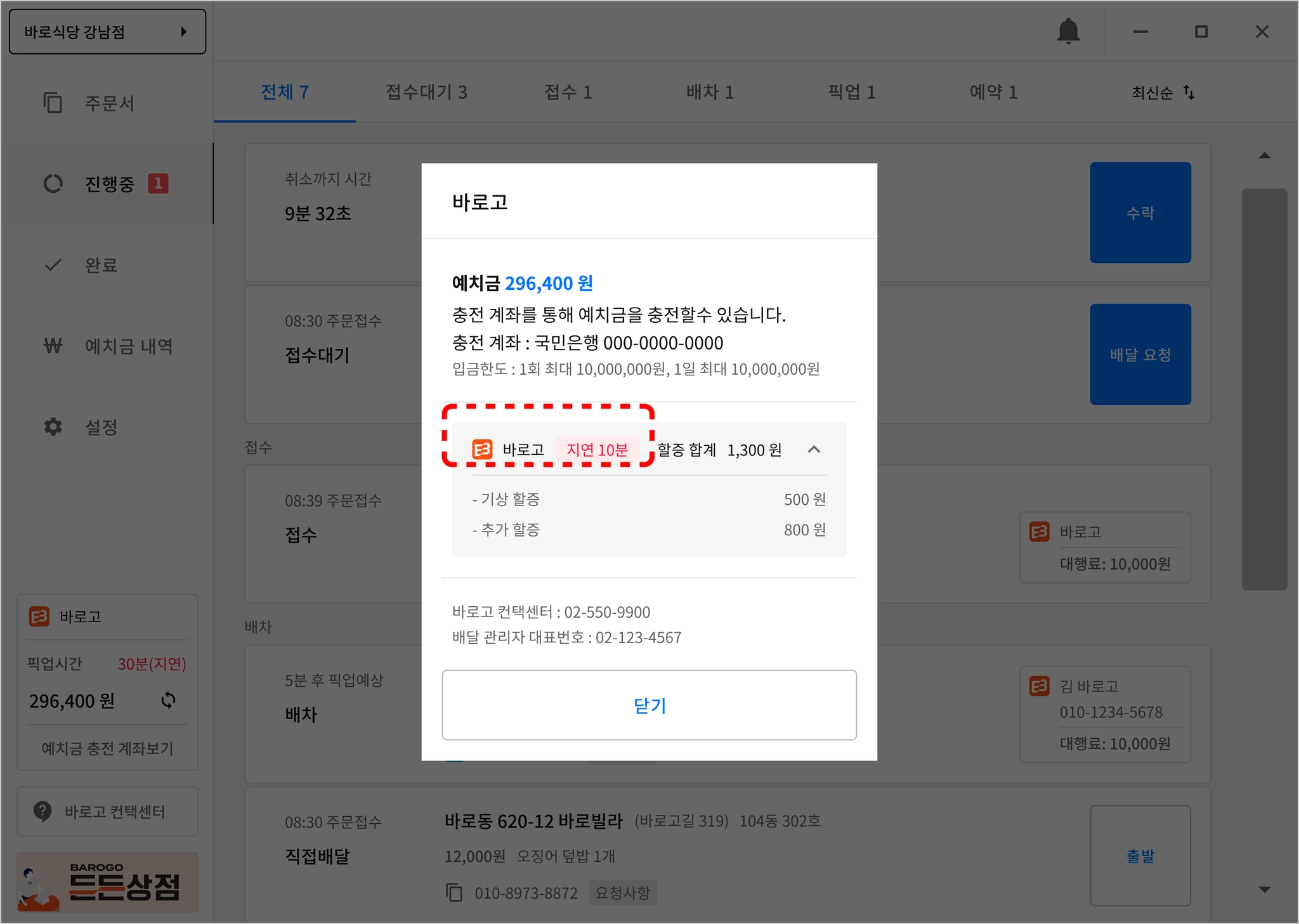 지연은 바로고 관리자(허브) 에서 설정하는 시간입니다. 좌측 하단 픽업시간 00분(지연) 이 지연 시간입니다.