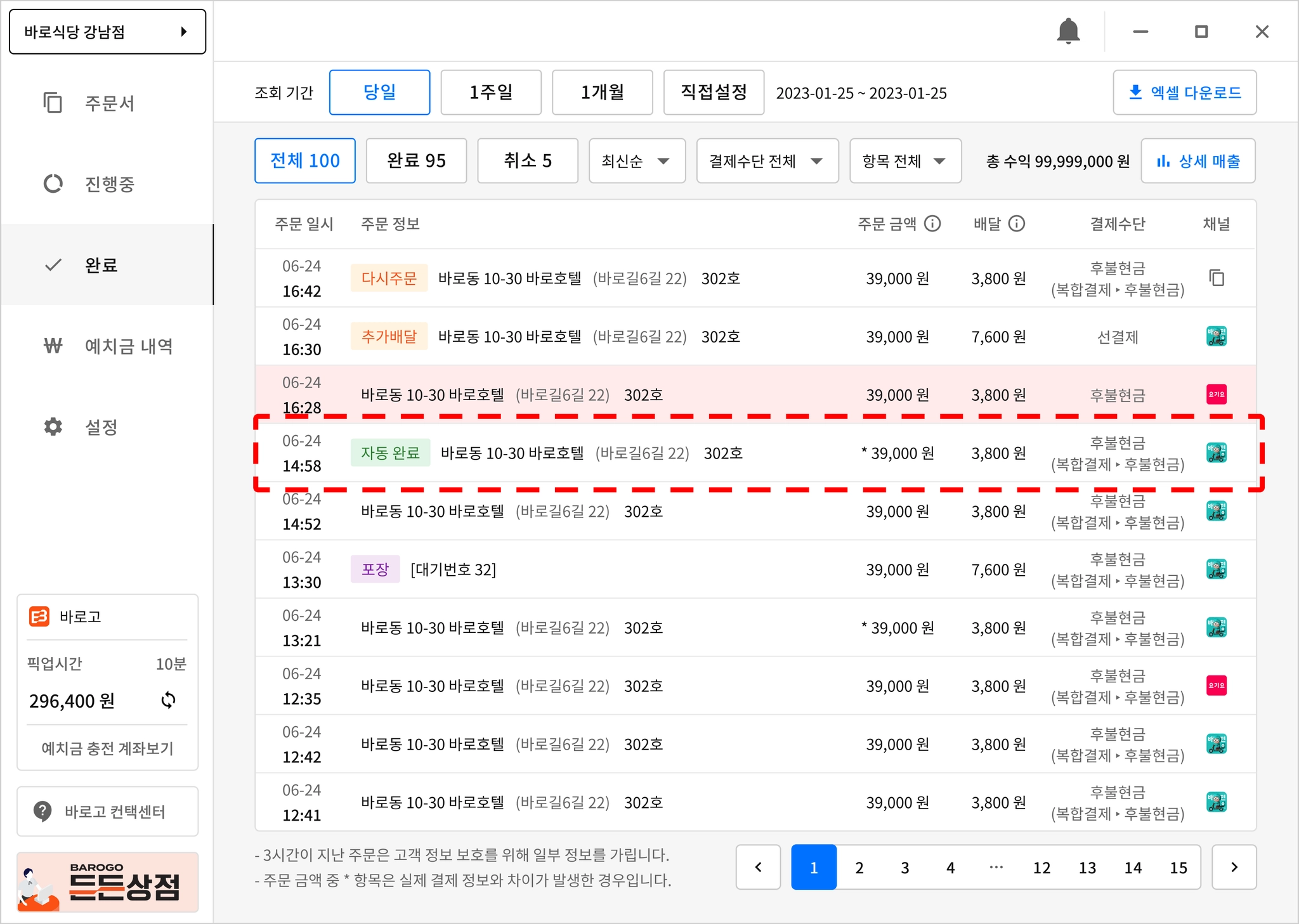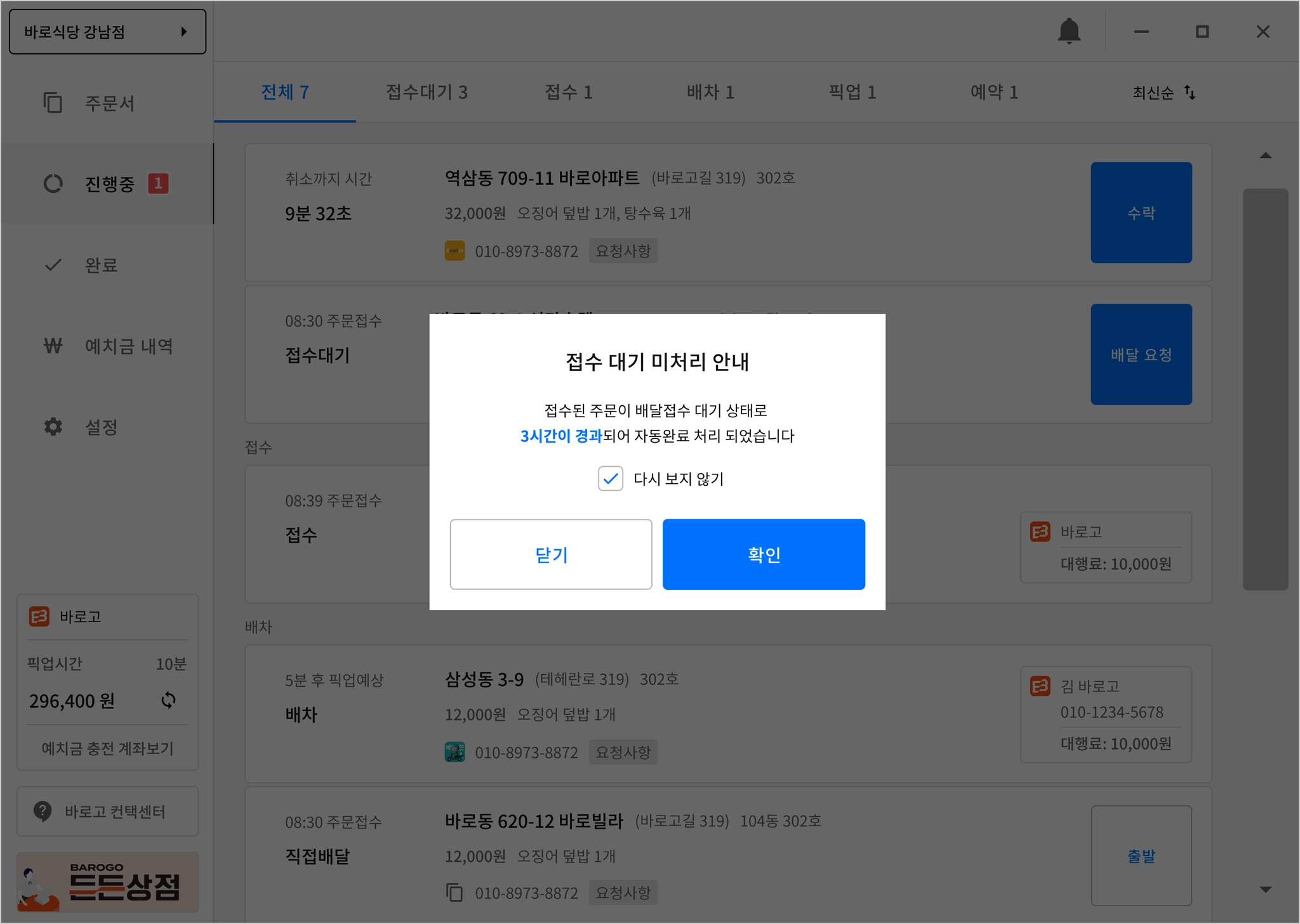 주문을 배달 진행, 취소 처리 없이 방치하는 경우 신규 접수 건과의 혼선으로, 자동 완료 처리됩니다.