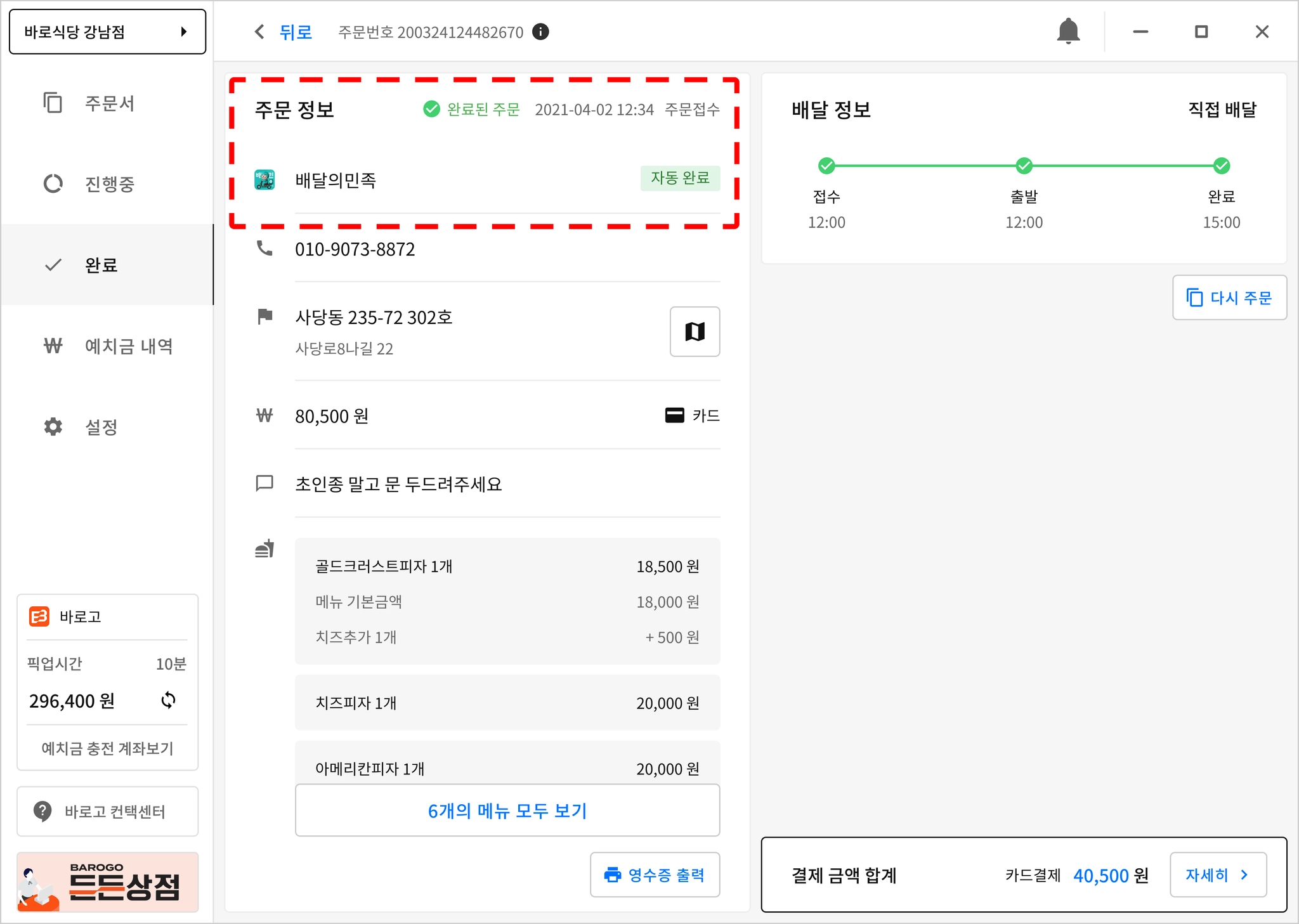 해당 주문은 완료 탭과 완료된 주문 상세 페이지 에서 자동 완료 라벨이 추가되어 구분 가능합니다.