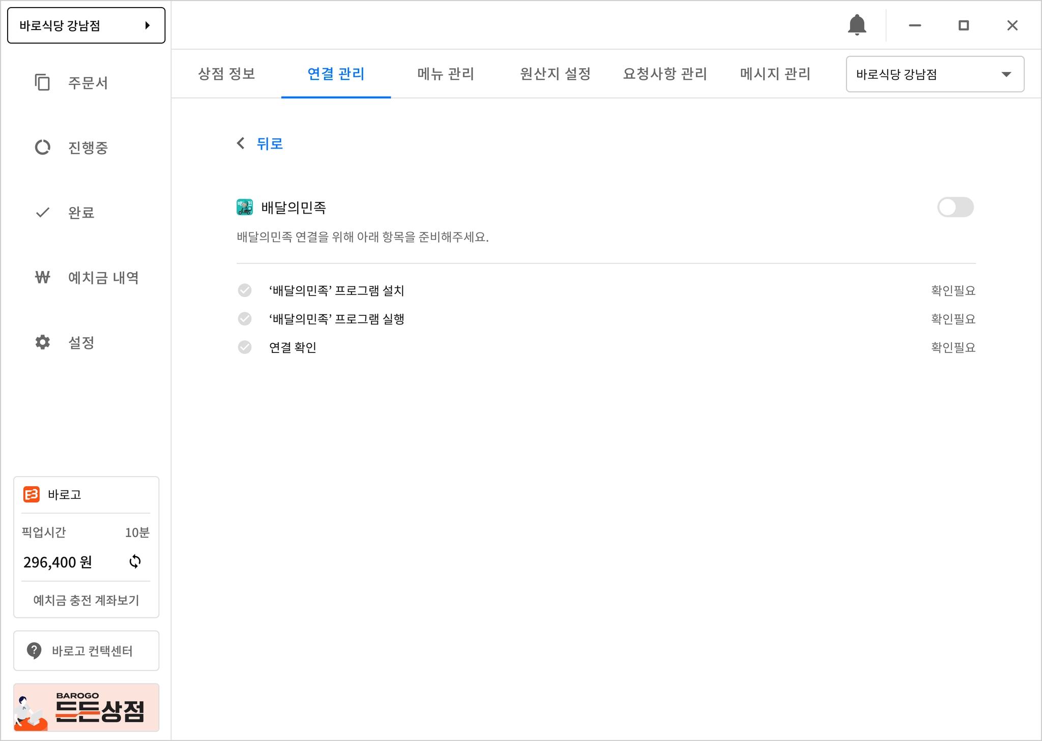 배달의민족 POS 프로그램에서 바로고 사장님 연결하기