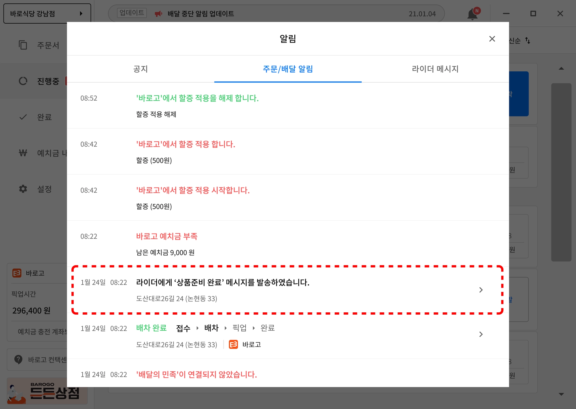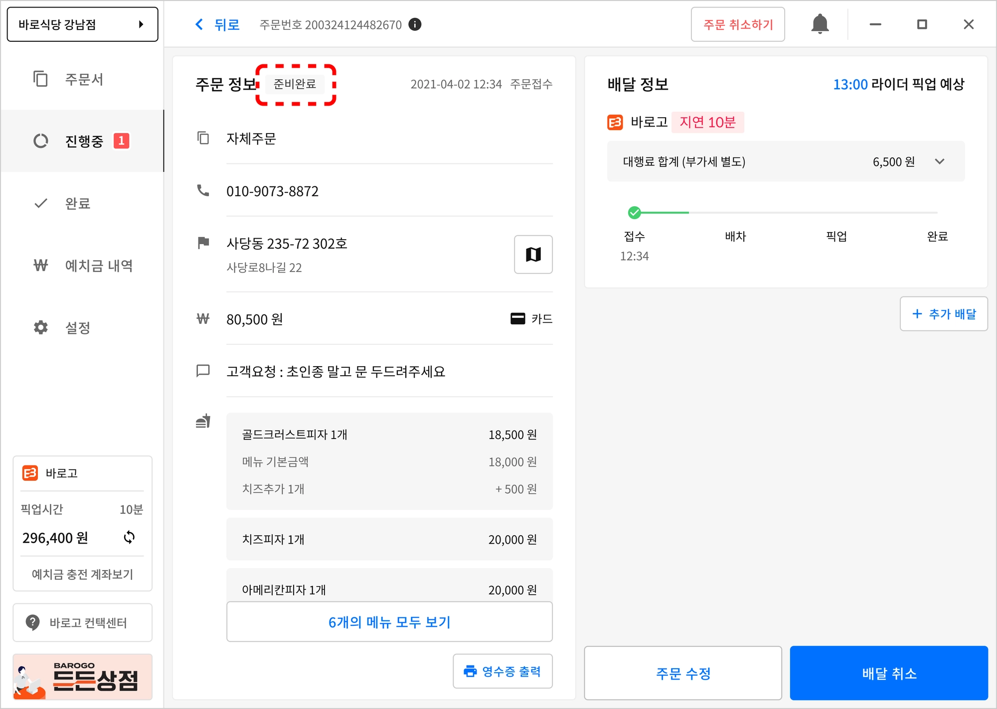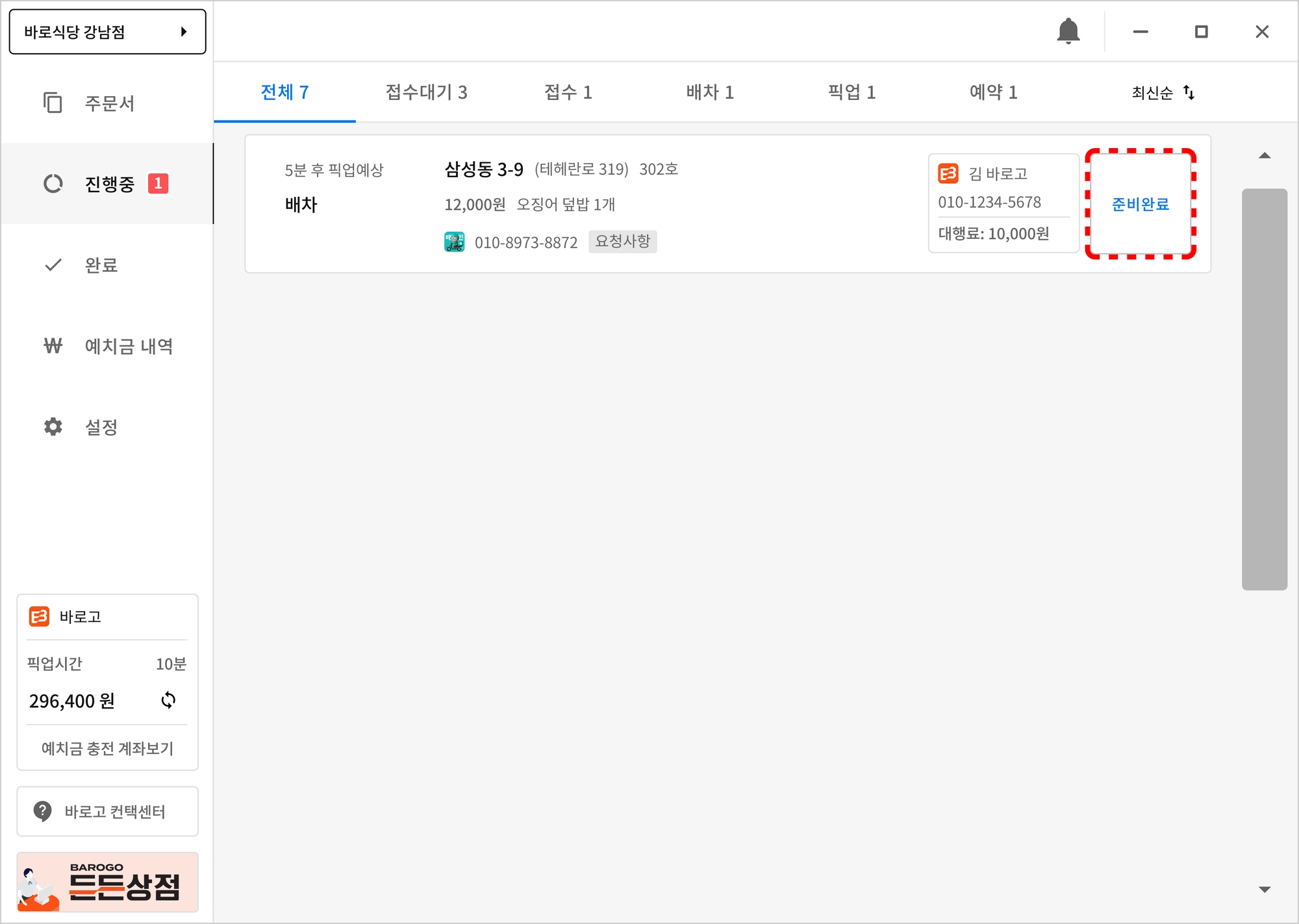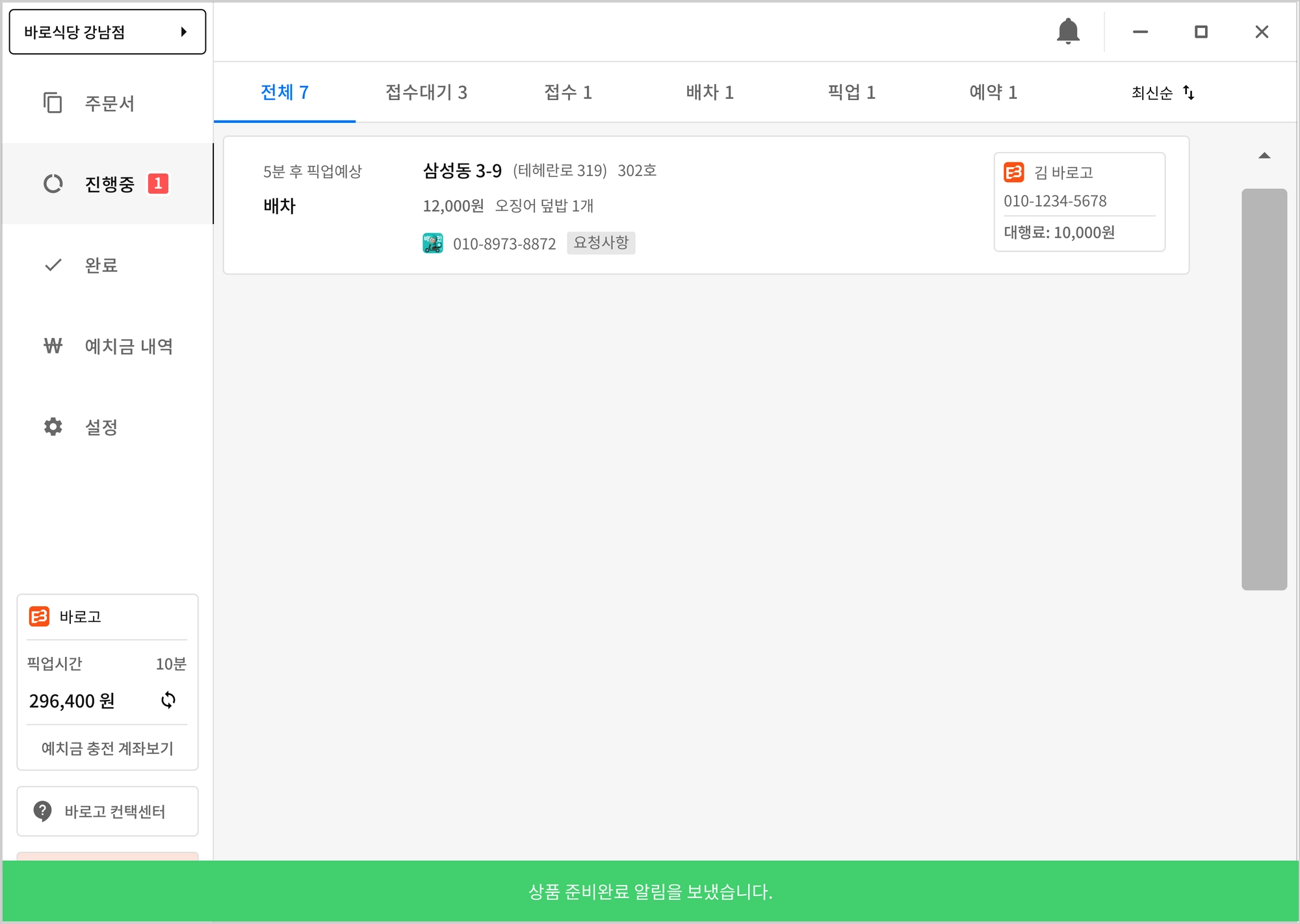 상품 준비완료는 ‘바로고’ 배달대행사만 가능하며, ‘접수’, ‘배차’ 완료 후 ‘준비완료’ 버튼이 표기됩니다.