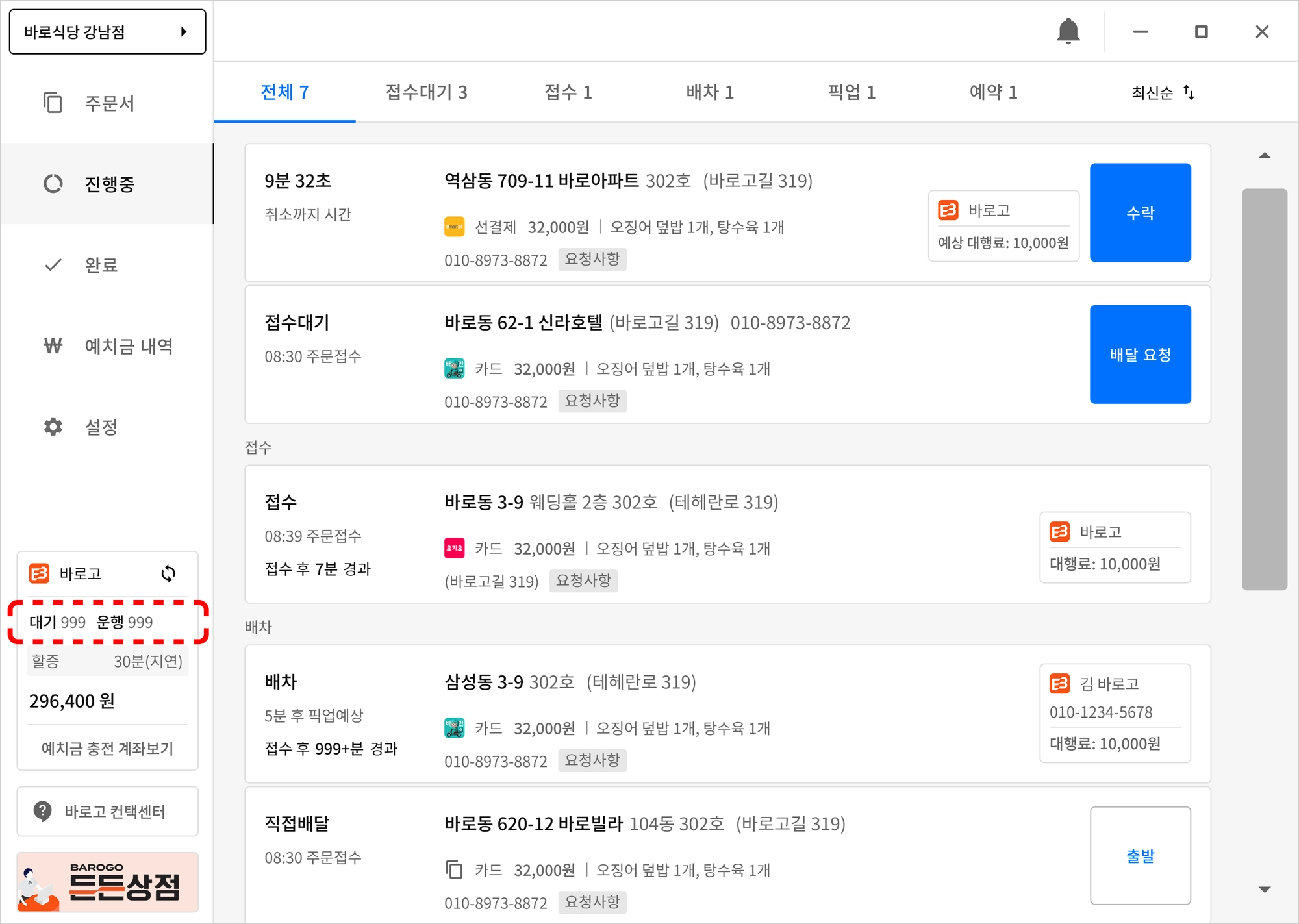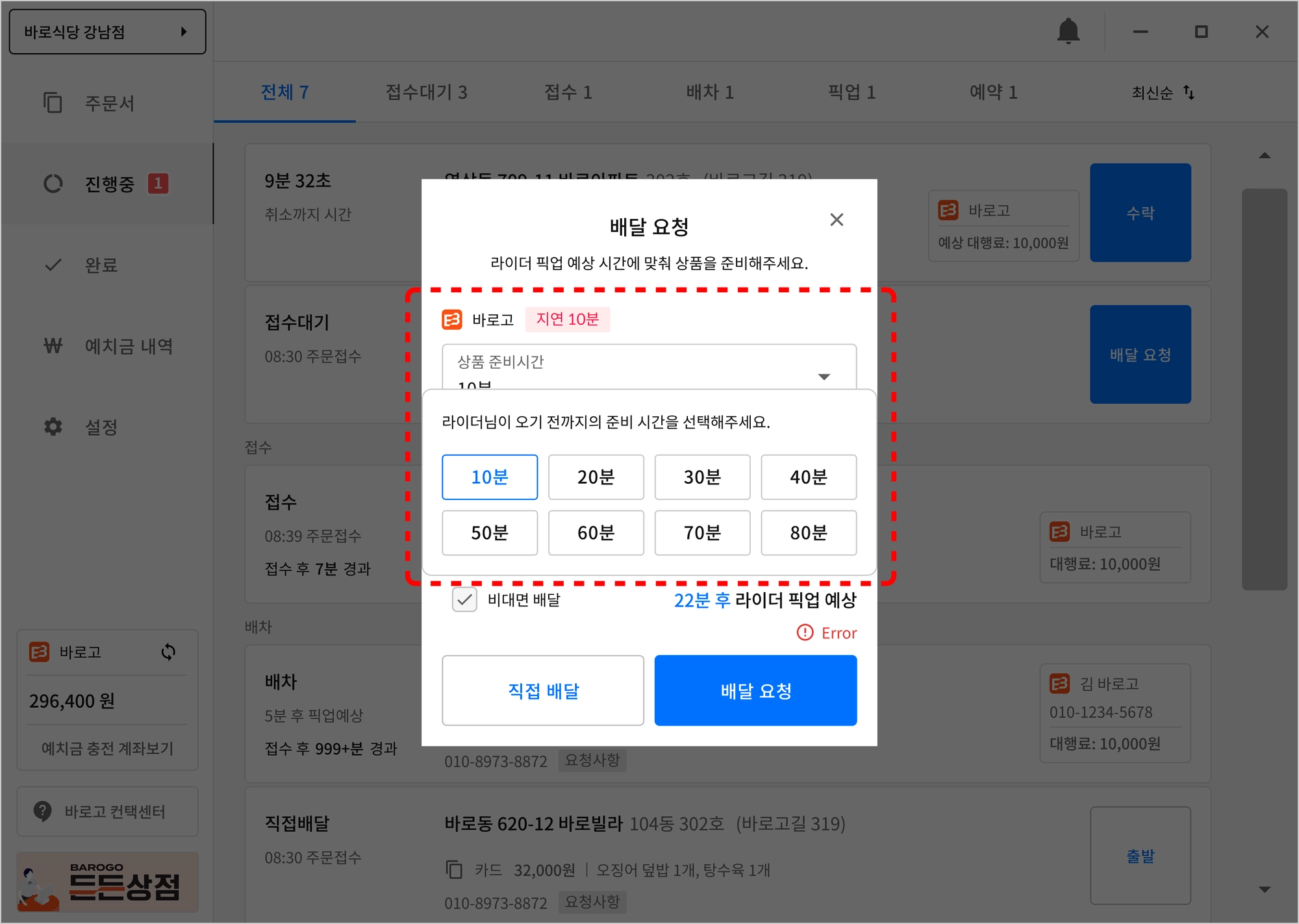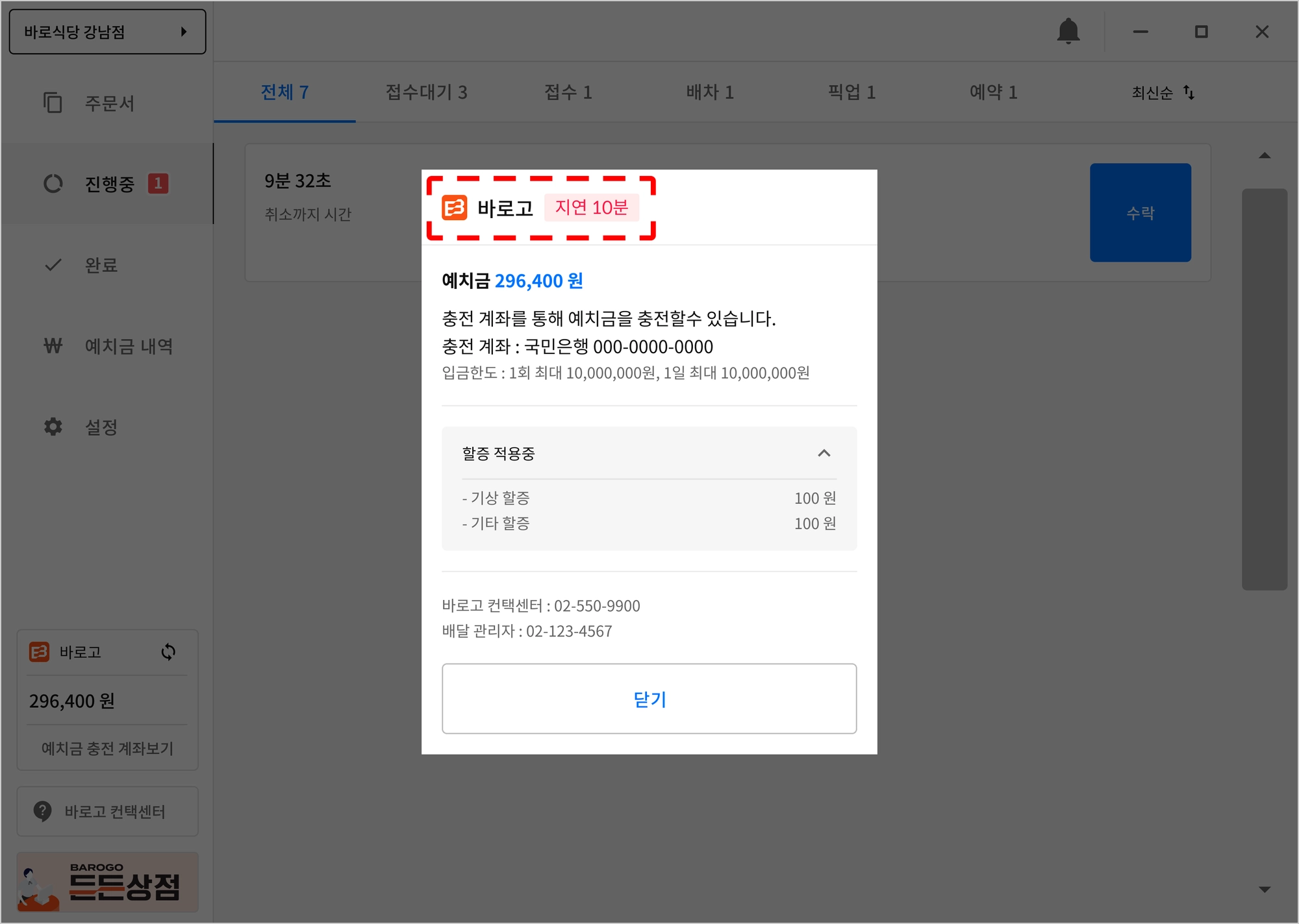 지연은 바로고 관리자(허브) 에서 설정하는 시간입니다. 좌측 하단 지연 00분이 지연 시간입니다.