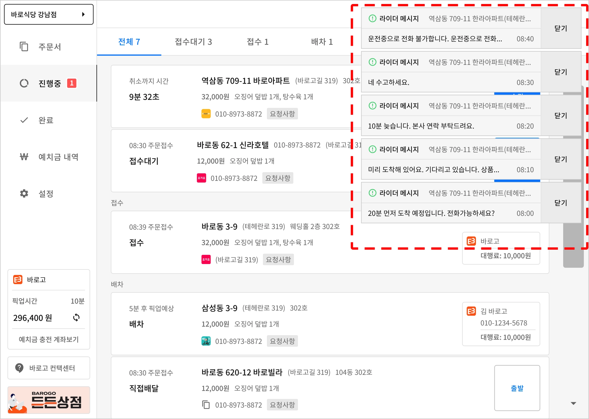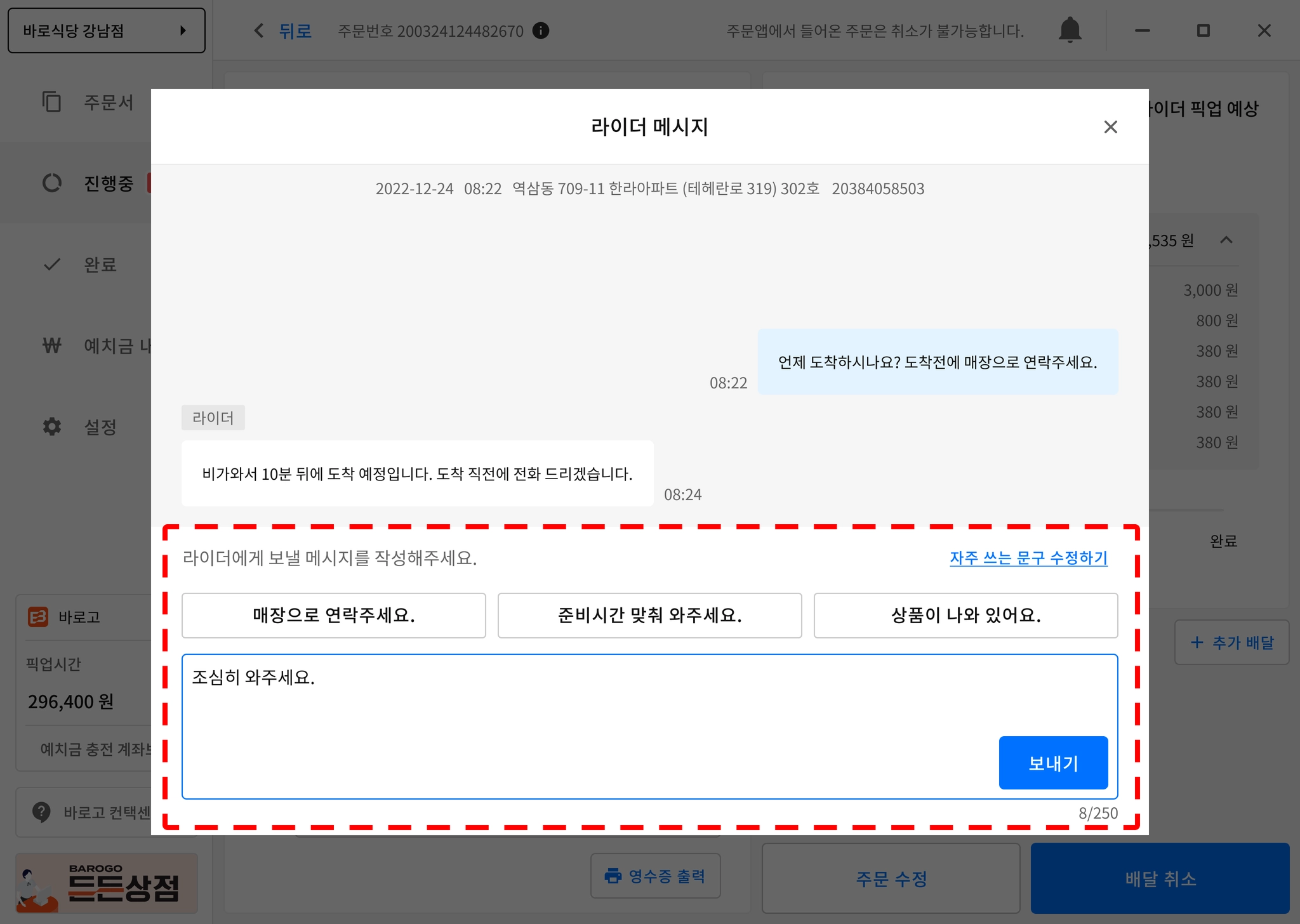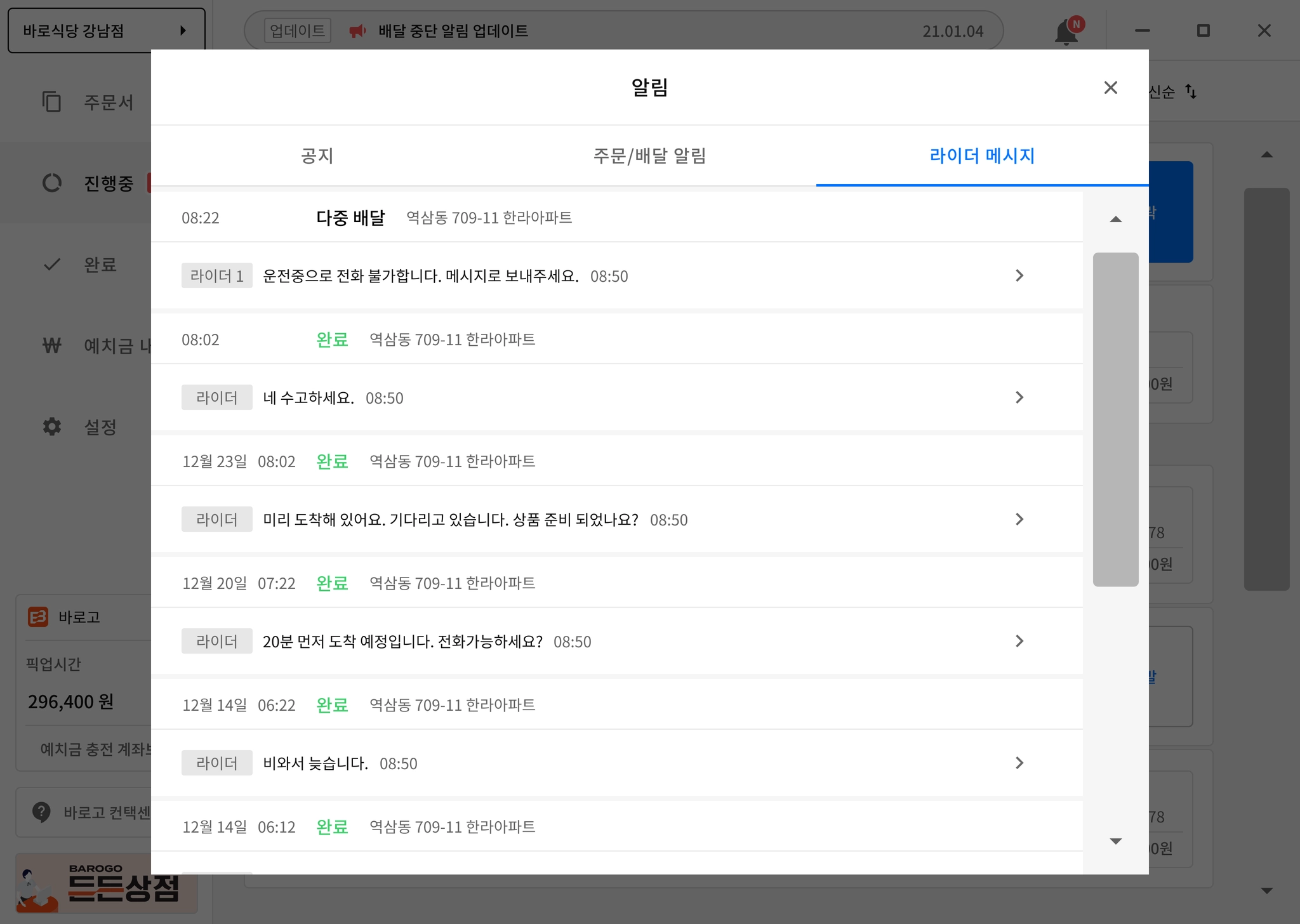 아이콘을 클릭하여 최근 7일간의 라이더가 보낸 메시지를 확인할 수 있습니다.