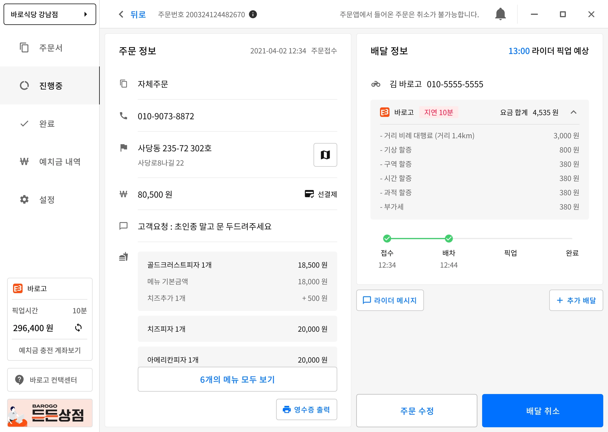 라이더 배차 완료 상태부터 배달 완료 후 바로고 정산 06:50 am 전까지