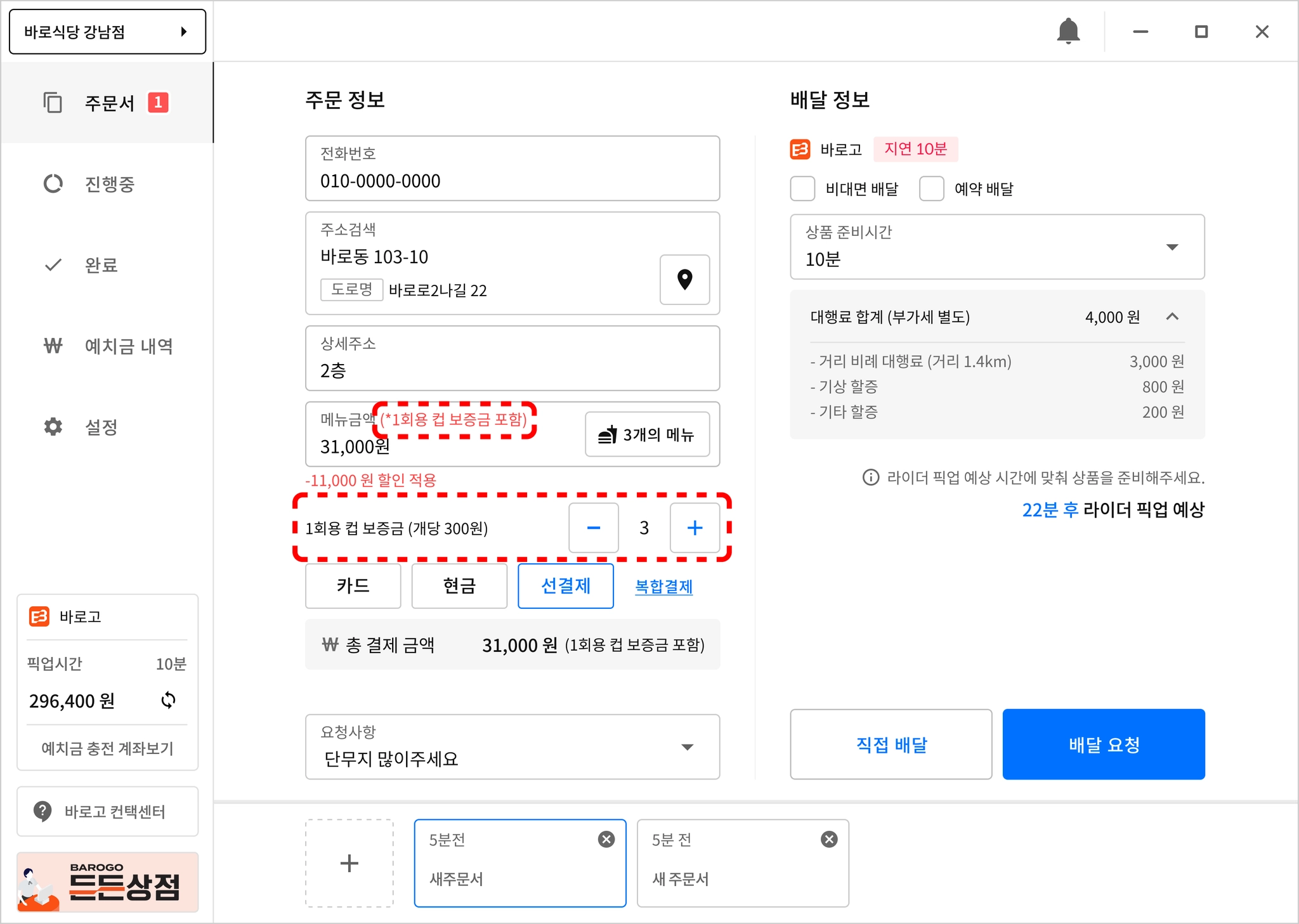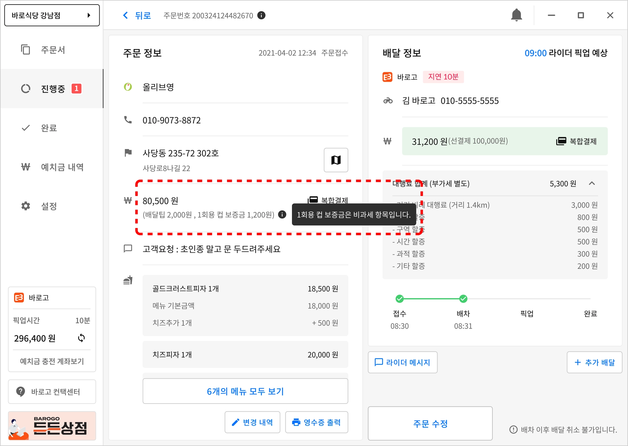 배달정보 녹색 박스 발생한 경우 배달대행사를 통해 1회용 컵 보증금 금액이 수정된 경우입니다.