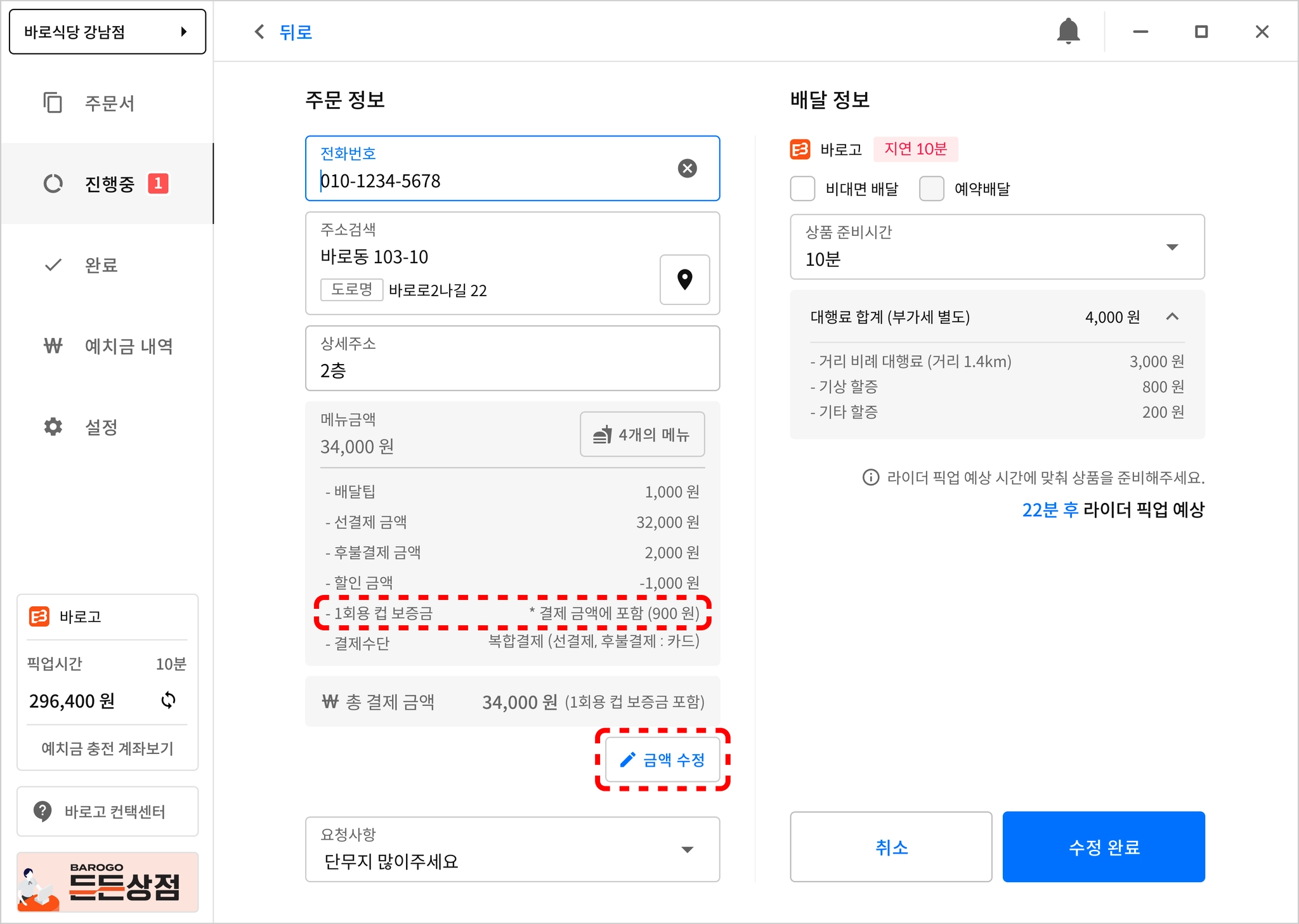 주문 제휴사 - 1회용 컵 보증금 확인 및 수정하기