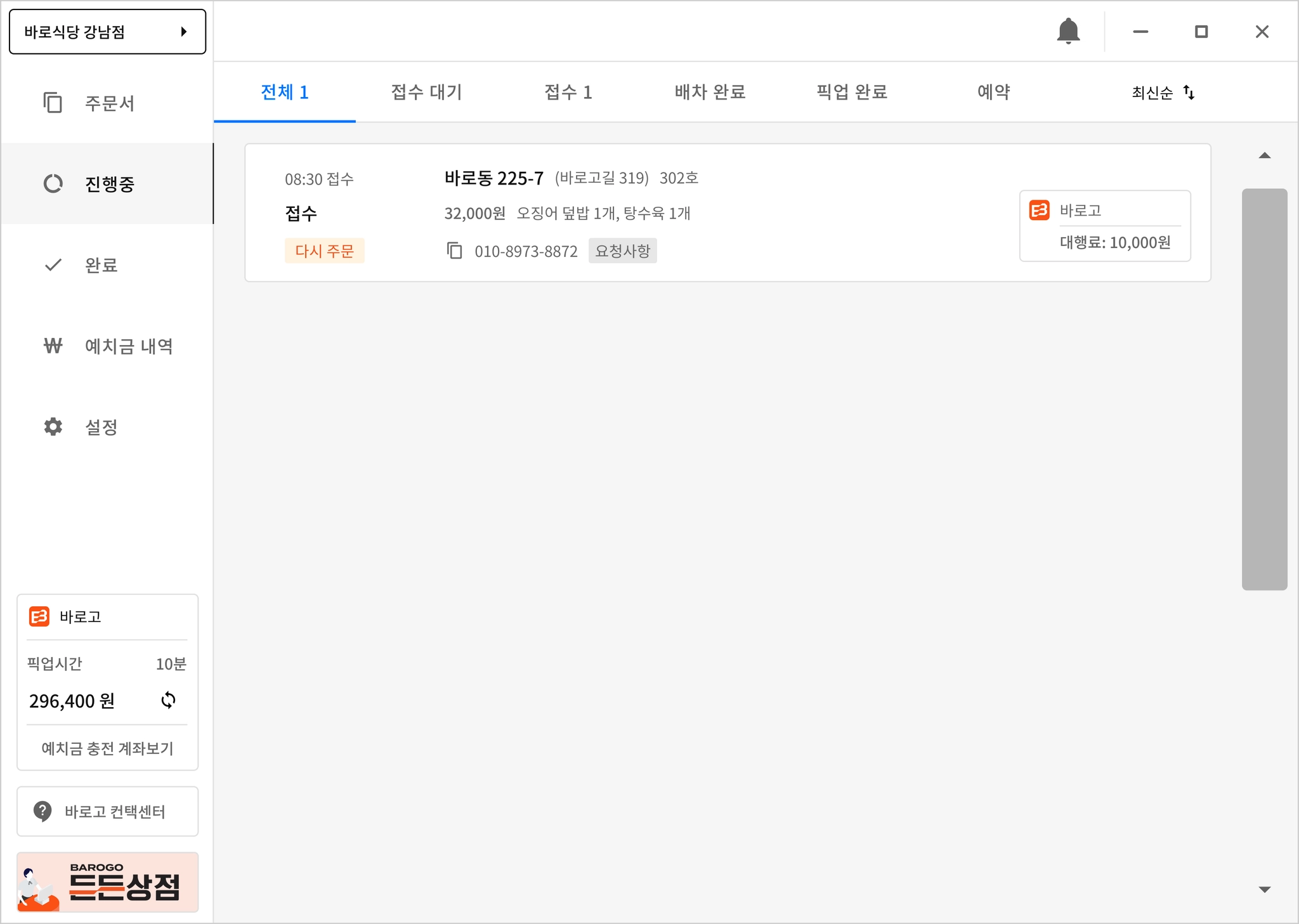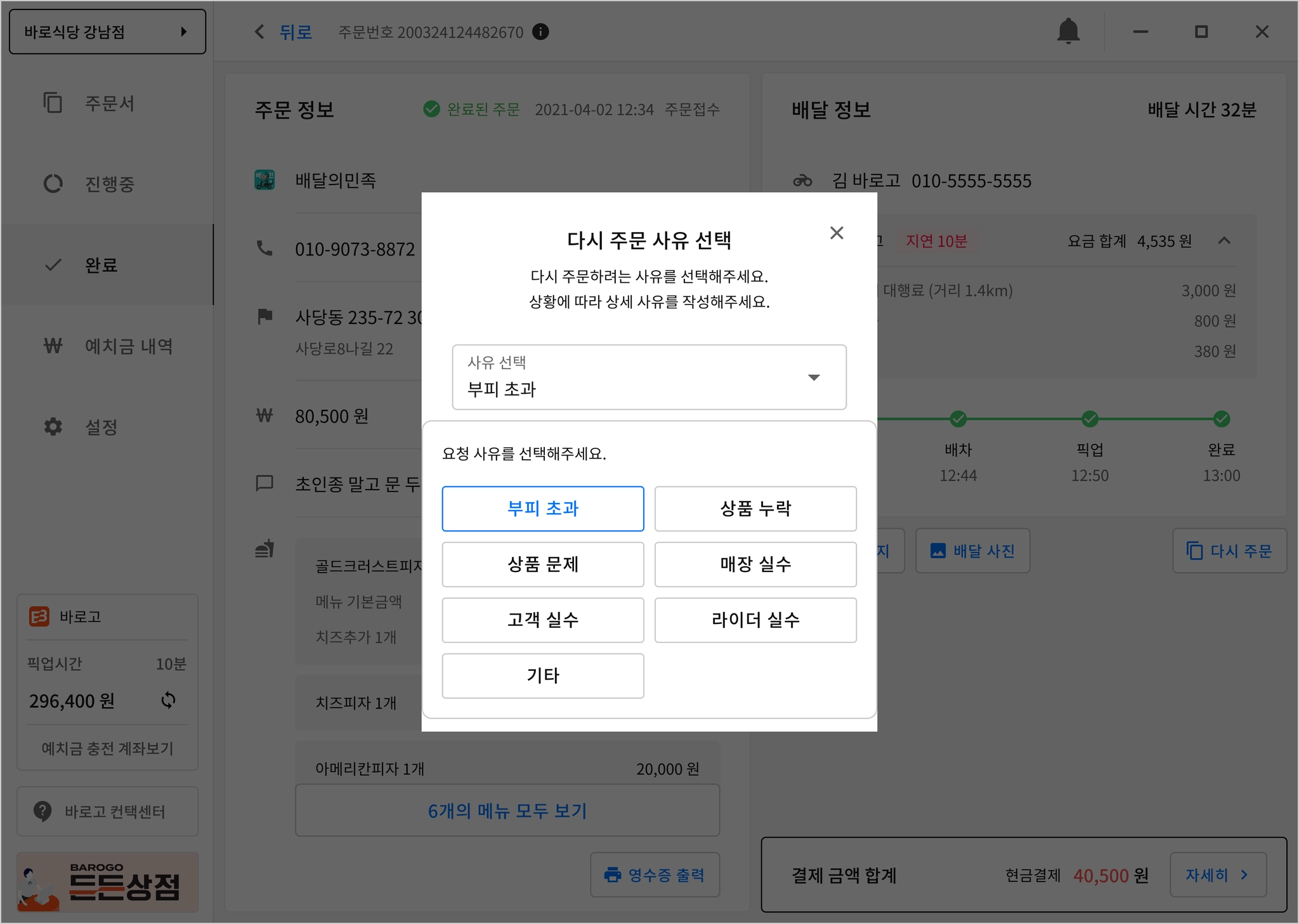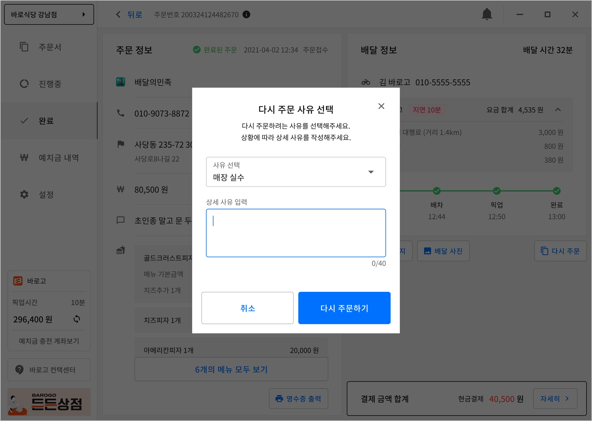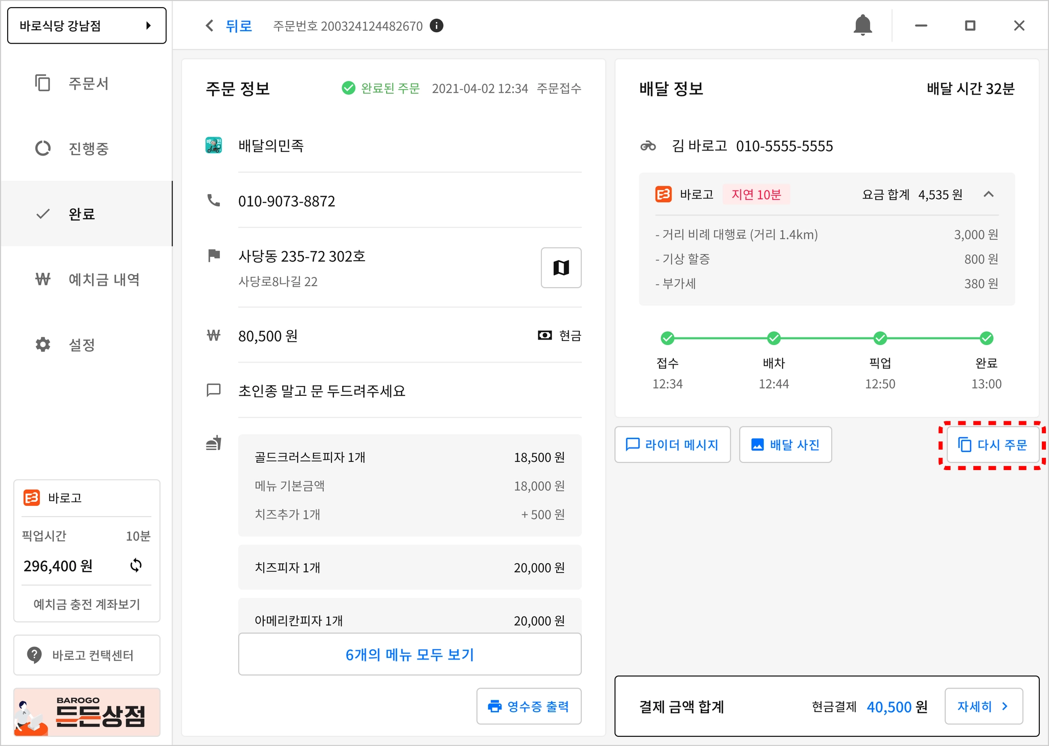 완료, 취소된 주문의 배달 주문이 필요할 때, 주문 정보를 복사하여 간편하게 배달을 다시 주문할 수 있습니다.