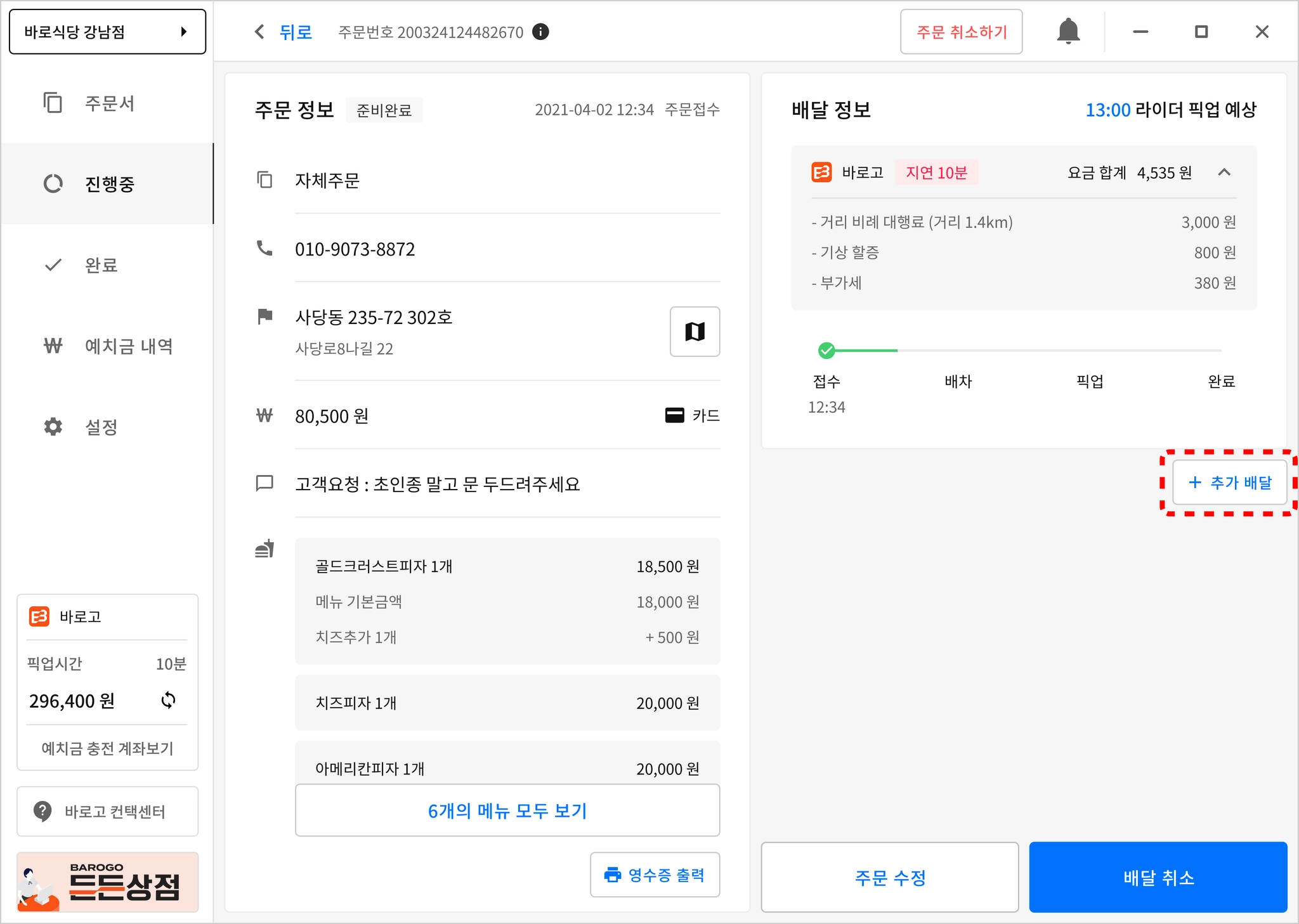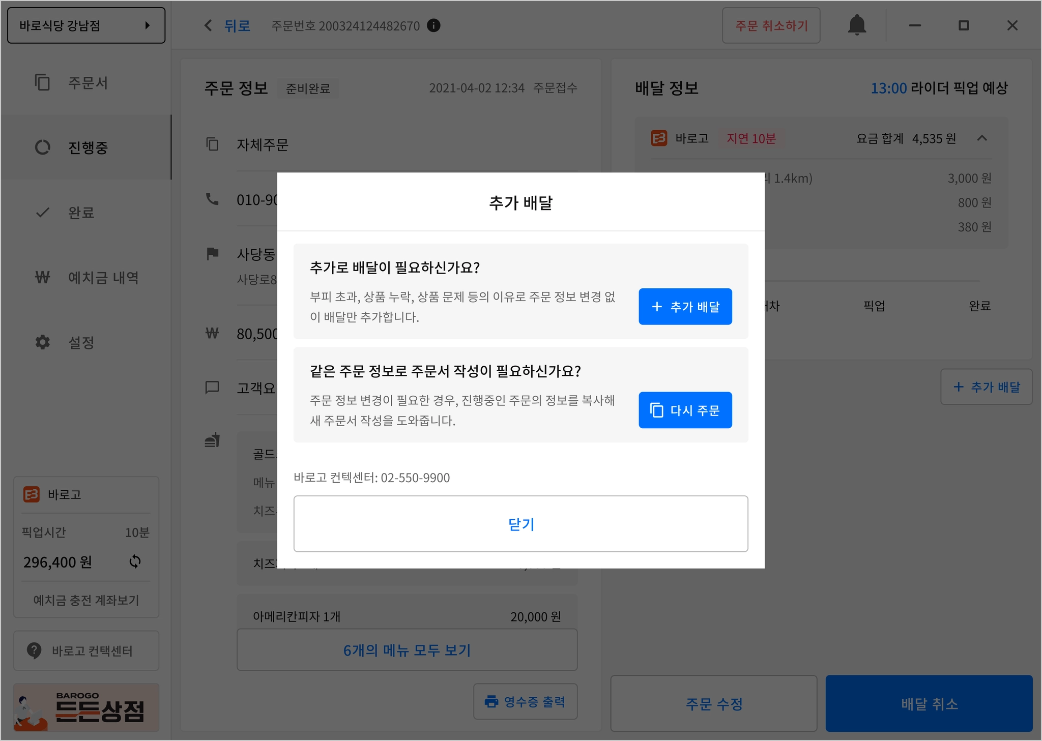 ❗️ 부피 초과, 상품 누락, 상품 품질 문제 등의 이유로 주문 정보 변경 없이 배달만 추가할 경우, 추가 배달 을 선택하세요.