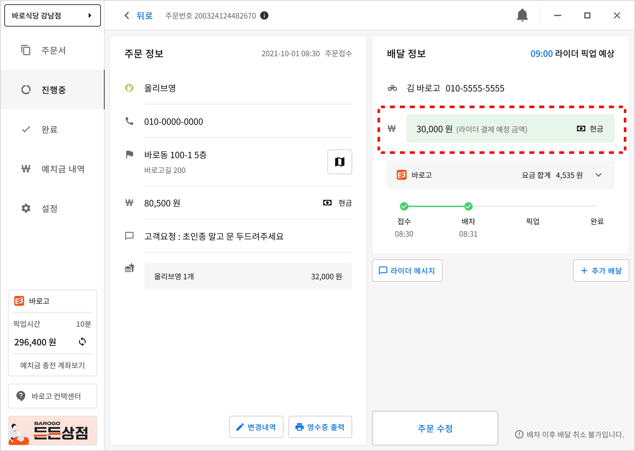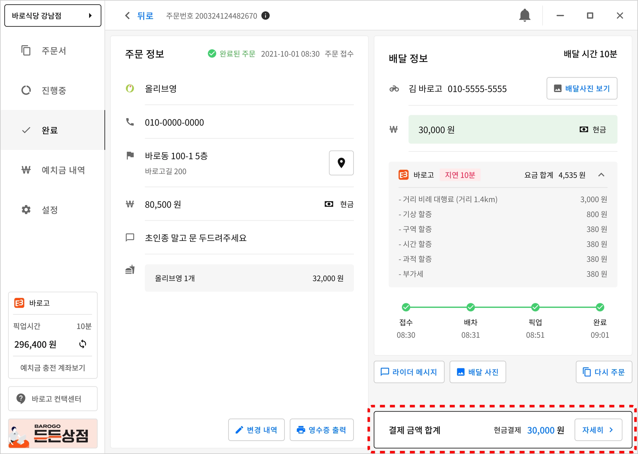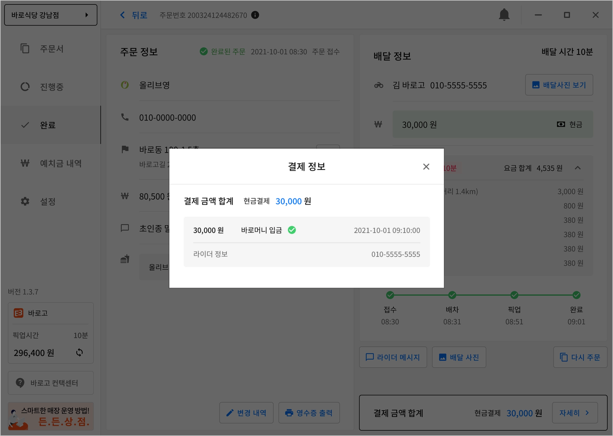라이더가 카드 결제 / 바로머니 입금을 완료하면, 주문 상세에서 결제 금액을 확인할 수 있어요. 결제 정보도 확인 가능합니다.