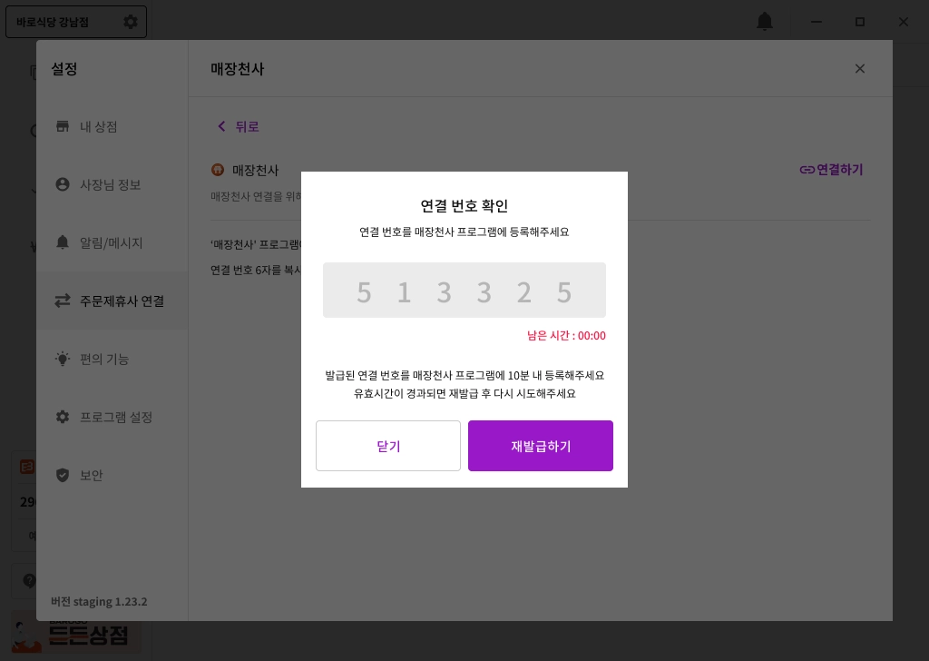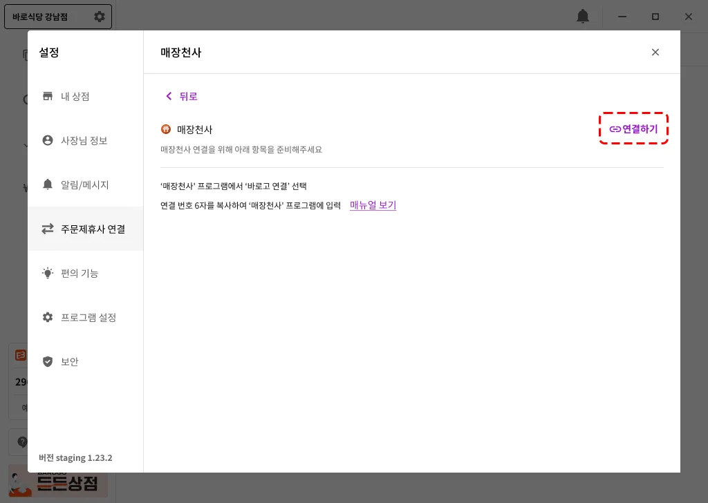 스토어프로그램에서 매장천사 6자리 연결 번호를 발급받습니다.