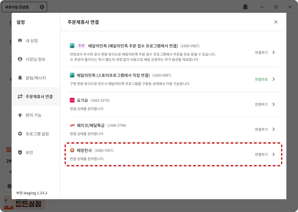 주문제휴사 연결 버튼을 선택하고 매장천사를 선택하세요.