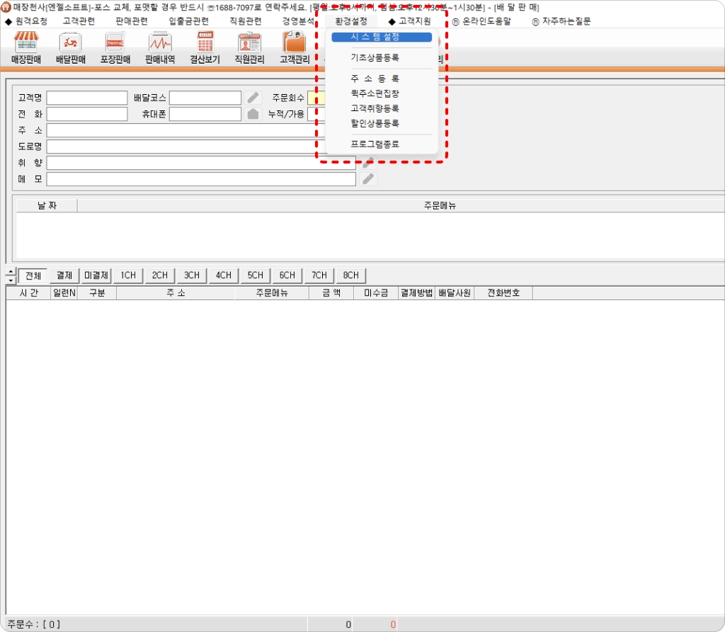 매장천사 프로그램에서 상단 메뉴 환경설정 시스템설정 을 선택합니다.