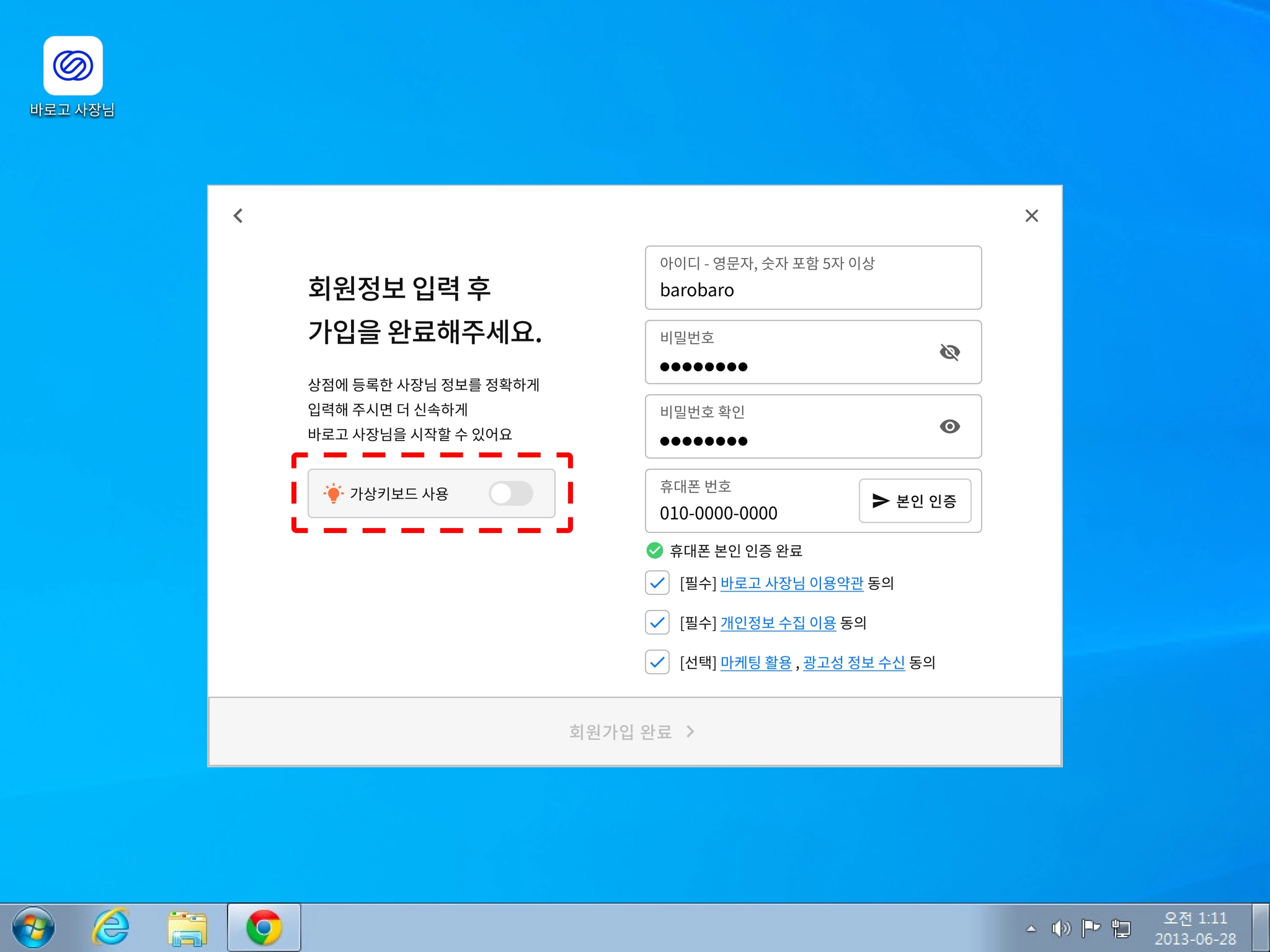 회원가입 시, 가상키보드 사용 스위치를 활성화할 수 있습니다.