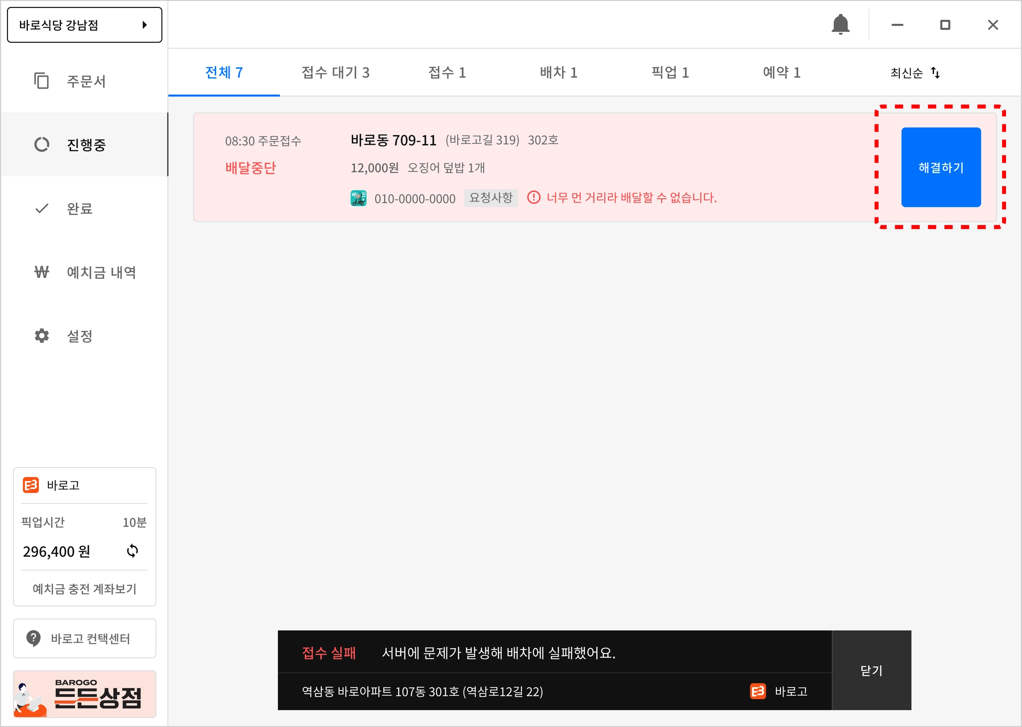 배달 거리가 멀거나, 예치금이 부족하여 배달이 중단될 수 있습니다.