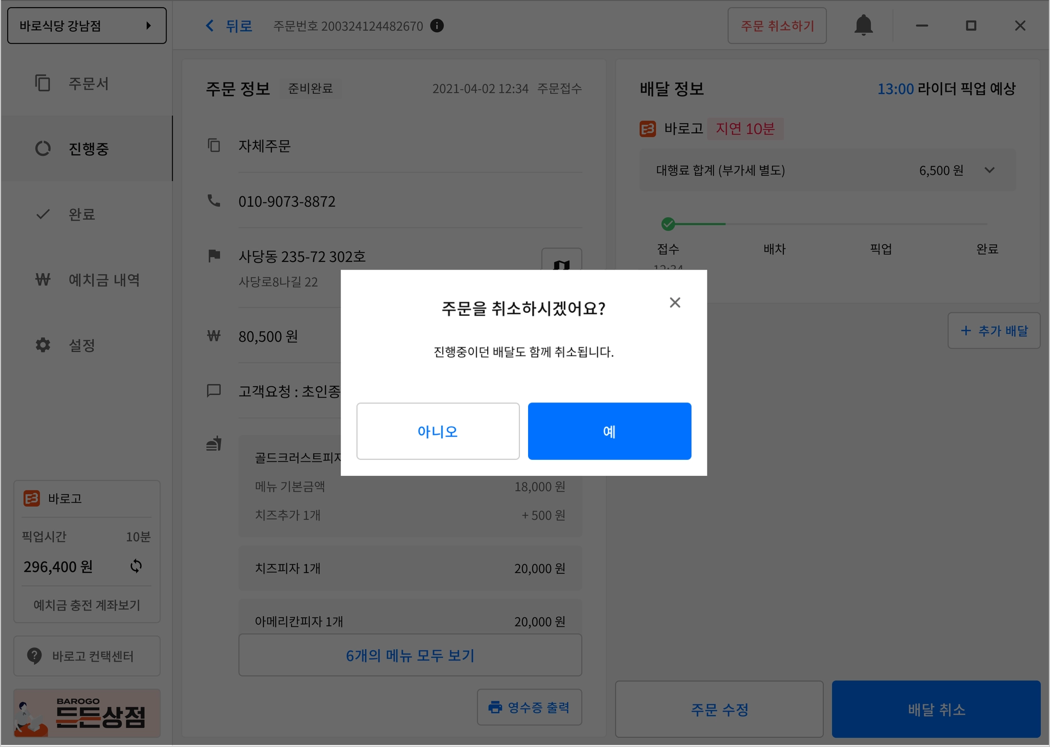 배달의민족 / 요기요 주문을 취소할 때 바로고 사장님 프로그램에서는 어떻게 해야 할까요?