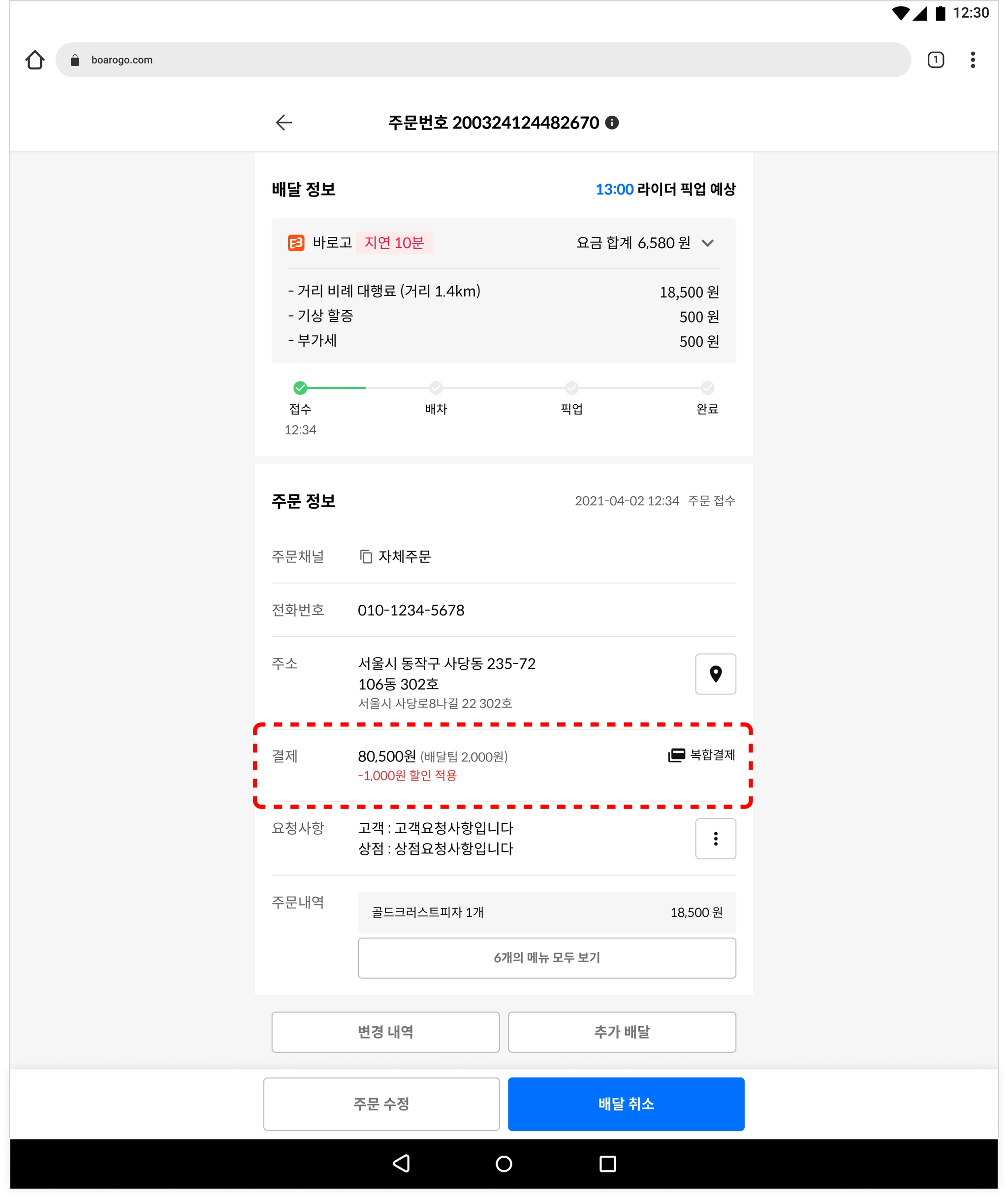 현장에서 고객 요청/사정으로 상품 대금 정보를 변경한 경우, 배달 정보에서 변경된 결제 수단과 금액을 확인할 수 있습니다.