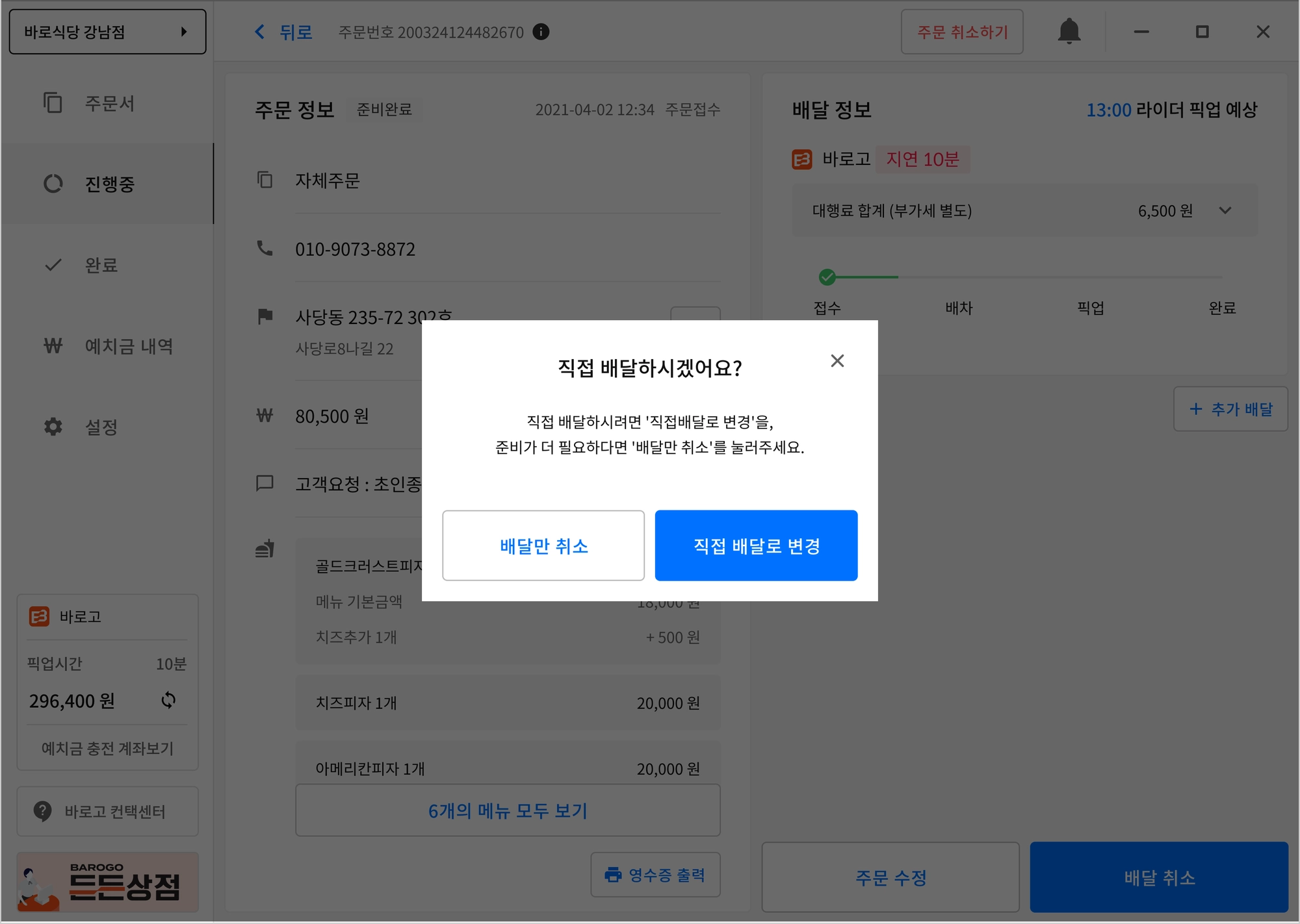 직접 배달 변경