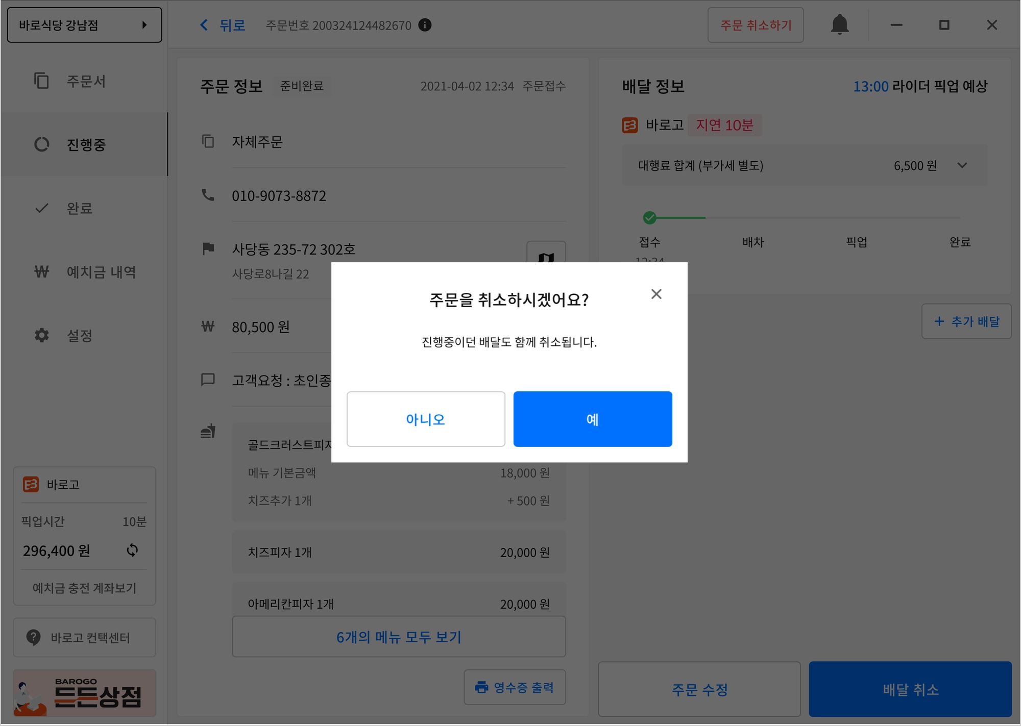 스토어프로그램에서 배달의민족/요기요 주문을 취소 할 수 없습니다.