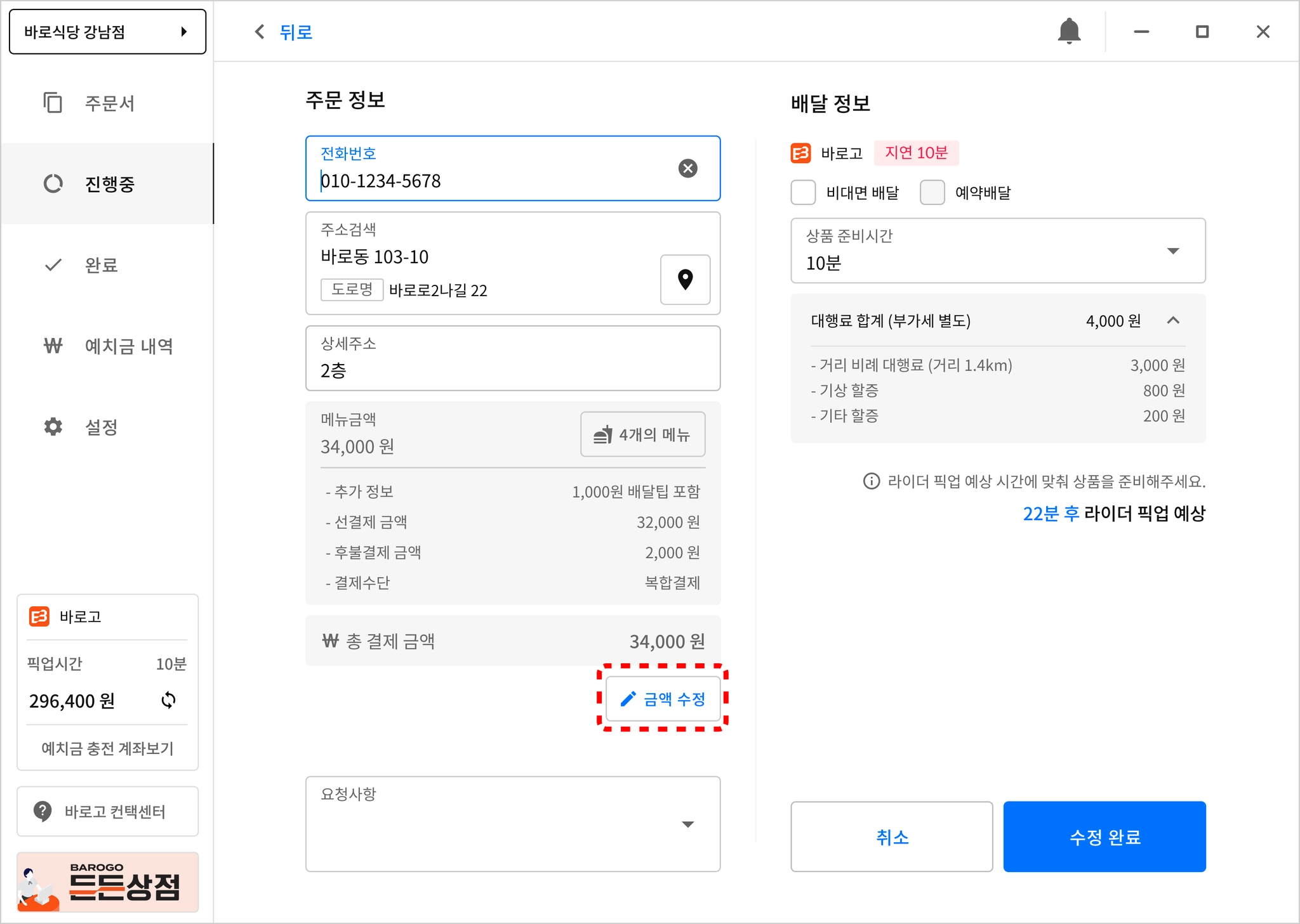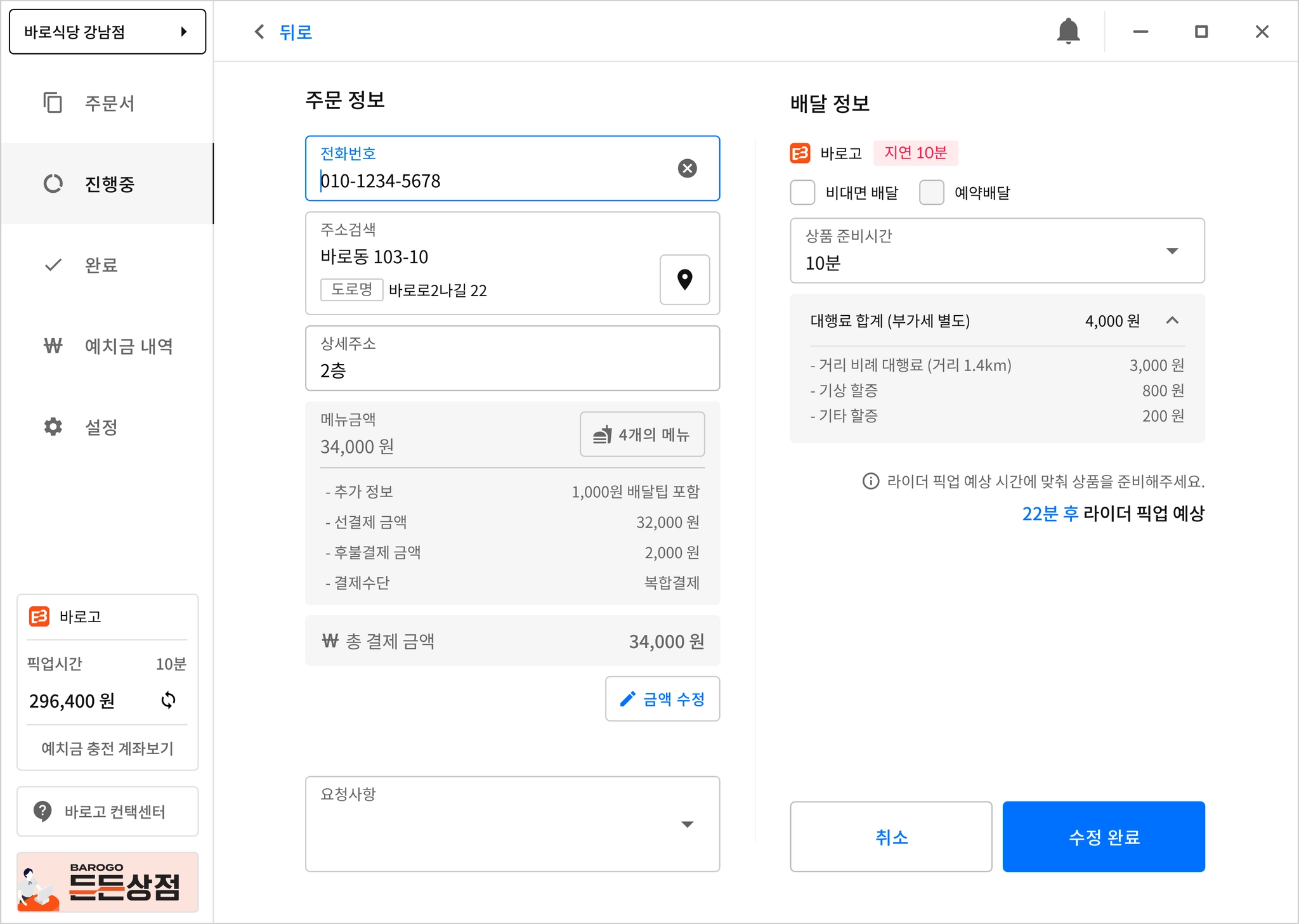 배달 주소가 변경되거나, 고객이 요청한 메뉴가 변경되는 등 주문 정보를 수정해야 할 때는 주문서 상세 화면에서 주문 수정 기능을 이용할 수 있습니다.