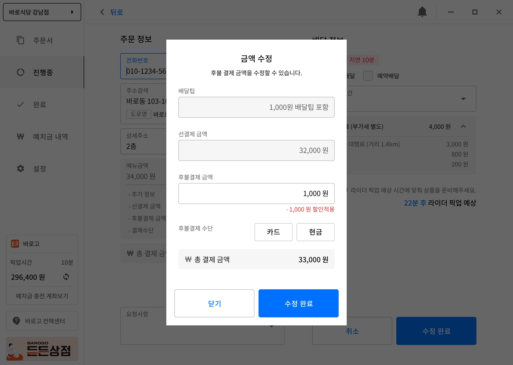 주문서 작성을 통해 수기로 접수한 주문의 경우, 메뉴 정보와 결제금액을 모두 수정이 가능합니다.