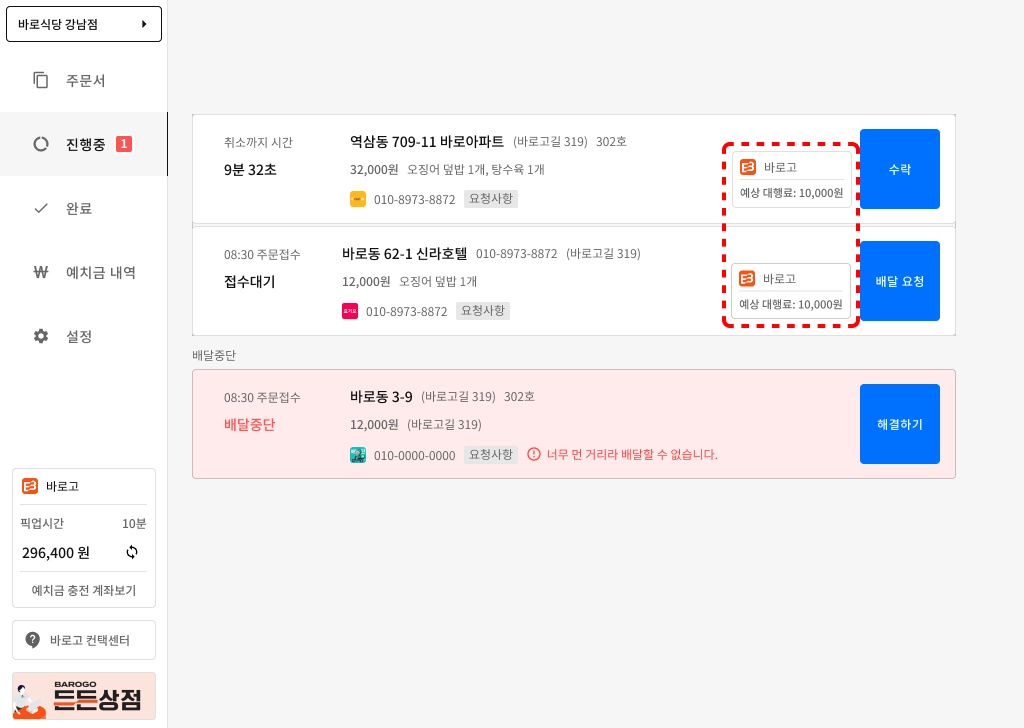 주문 접수 시 진행 중 리스트 내 배달 예상 대행료가 표시(부가세 별도)됩니다.