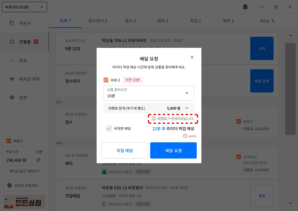 예상 대행료와 실제 배달 대행료가 다를 경우 대행료가 변경되었습니다. 안내 문구를 확인 하실 수 있습니다.